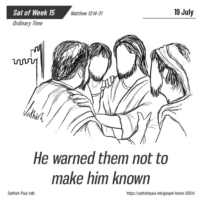 Une fois sortis de la synagogue, les pharisiens se réunirent en conseil contre Jésus pour voir comment le faire périr. Jésus, l’ayant appris, se retira de là ; beaucoup de gens le suivirent, et il les guérit tous. Mais il leur défendit vivement de parler de lui. (Mt 12, 14-21)