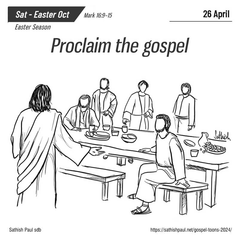 Enfin, il se manifesta aux Onze eux-mêmes pendant qu’ils étaient à table: il leur reprocha leur manque de foi et la dureté de leurs cœurs parce qu’ils n’avaient pas cru ceux qui l’avaient contemplé ressuscité. Puis il leur dit: «Allez dans le monde entier. Proclamez l’Évangile à toute la création.» (Mc 16,9-15)
