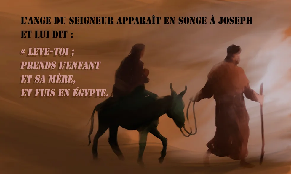Après le départ des mages, voici que l’ange du Seigneur apparaît en songe à Joseph et lui dit: «Lève-toi; prends l’enfant et sa mère, et fuis en Égypte. Reste là-bas jusqu’à ce que je t’avertisse, car Hérode va rechercher l’enfant pour le faire périr.» Joseph se leva; dans la nuit, il prit l’enfant et sa mère, et se retira en Égypte. (Mt 2,13-18)