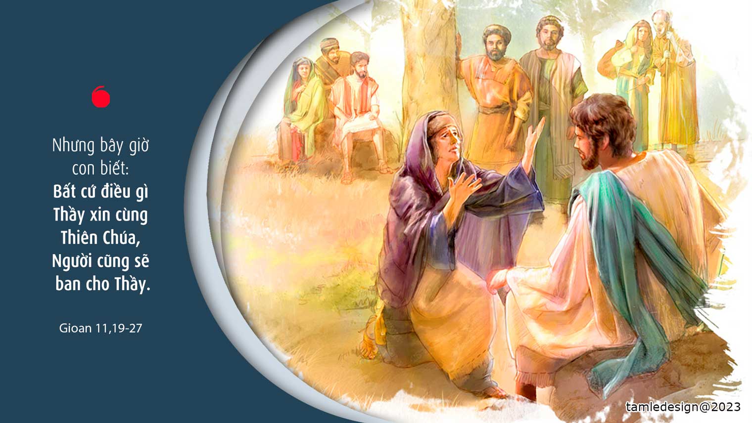 Khi ấy, nhiều người Do-thái đến chia buồn với hai cô Mác-ta và Ma-ri-a, vì em các cô mới qua đời. Vừa được tin Đức Giê-su đến, cô Mác-ta liền ra đón Người. Còn cô Ma-ri-a thì ngồi ở nhà. Cô Mác-ta nói với Đức Giê-su: “Thưa Thầy, nếu có Thầy ở đây, em con đã không chết. Nhưng bây giờ con biết: Bất cứ điều gì Thầy xin cùng Thiên Chúa, Người cũng sẽ ban cho Thầy.” Đức Giê-su nói: “Em chị sẽ sống lại!” Cô Mác-ta thưa: “Con biết em con sẽ sống lại, khi kẻ chết sống lại trong ngày sau hết.” Đức Giê-su liền phán: “Chính Thầy là sự sống lại và là sự sống. Ai tin vào Thầy, thì dù đã chết, cũng sẽ được sống. Ai sống và tin vào Thầy, sẽ không bao giờ phải chết. Chị có tin thế không?” Cô Mác-ta đáp: “Thưa Thầy, có. Con vẫn tin Thầy là Đức Ki-tô, Con Thiên Chúa, Đấng phải đến thế gian.” Đó là lời Chúa.