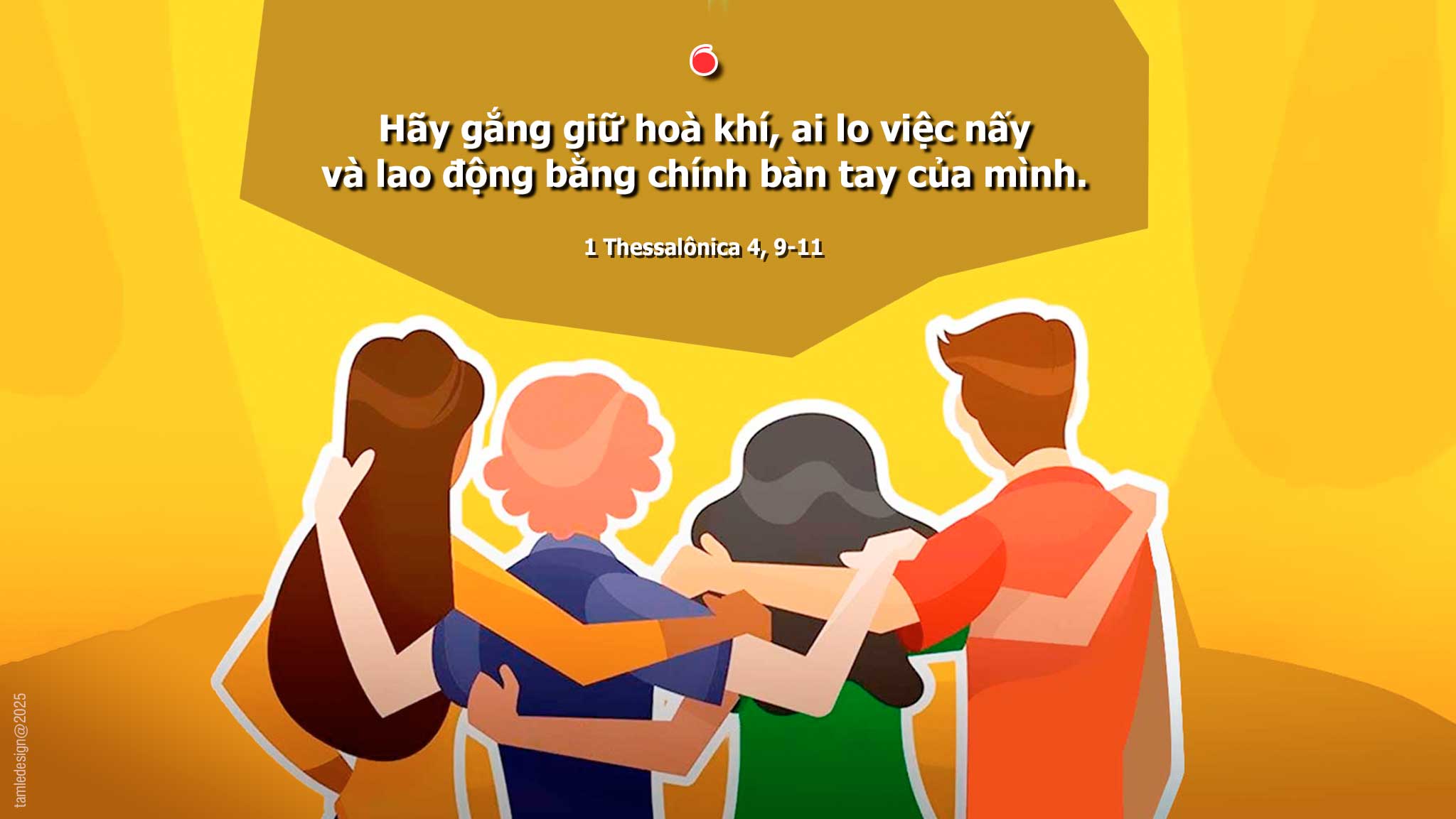 Thưa anh em, về tình huynh đệ, anh em không cần ai viết cho anh em, vì chính anh em đã được Thiên Chúa dạy phải thương yêu nhau, và anh em cũng đang làm như vậy cho tất cả các anh em trong toàn miền Ma-kê-đô-ni-a. Nhưng thưa anh em, tôi khuyên nhủ anh em hãy tiến tới nhiều hơn nữa. Hãy gắng giữ hoà khí, ai lo việc nấy và lao động bằng chính bàn tay của mình, như chính tôi đã truyền cho anh em. Đó là lời Chúa.