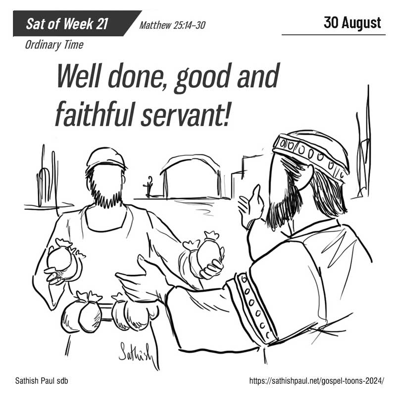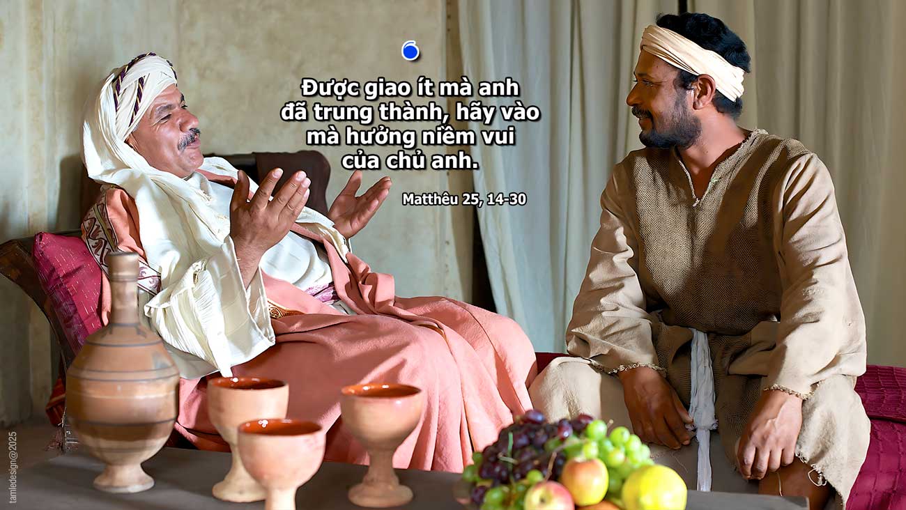 Khi ấy, Đức Giê su kể cho các môn đệ nghe dụ ngôn này: “Người kia sắp đi xa, liền gọi đầy tớ đến mà giao phó của cải mình cho họ. Ông cho người này năm yến, người kia hai yến, người khác nữa một yến, tuỳ khả năng riêng mỗi người. Rồi ông ra đi. Lập tức, người đã lãnh năm yến lấy số tiền ấy đi làm ăn buôn bán, và gây lời được năm yến khác. Cũng vậy, người đã lãnh hai yến gây lời được hai yến khác. Còn người đã lãnh một yến thì đi đào lỗ chôn giấu số bạc của chủ. Sau một thời gian lâu dài, ông chủ đến tính sổ với các đầy tớ và thanh toán sổ sách với họ. Người đã lãnh năm yến tiến lại gần, đưa năm yến khác, và nói: “Thưa ông chủ, ông đã giao cho tôi năm yến, tôi đã gây lời được năm yến khác đây.” Ông chủ nói với người ấy: “Khá lắm! hỡi đầy tớ tài giỏi và trung thành! Được giao ít mà anh đã trung thành, thì tôi sẽ giao nhiều cho anh. Hãy vào mà hưởng niềm vui của chủ anh! ” Người đã lãnh hai yến cũng tiến lại gần và nói: “Thưa ông chủ, ông đã giao cho tôi hai yến, tôi đã gây lời được hai yến khác đây.” Ông chủ nói với người ấy: “Khá lắm! hỡi đầy tớ tài giỏi và trung thành! Được giao ít mà anh đã trung thành, thì tôi sẽ giao nhiều cho anh. Hãy vào mà hưởng niềm vui của chủ anh! ” Rồi người đã lãnh một yến cũng tiến lại gần và nói: “Thưa ông chủ, tôi biết ông là người hà khắc, gặt chỗ không gieo, thu nơi không vãi. Vì thế, tôi đâm sợ, mới đem chôn giấu yến bạc của ông dưới đất. Của ông đây, ông cầm lấy! ” Ông chủ đáp: “Hỡi đầy tớ tồi tệ và biếng nhác! Anh đã biết tôi gặt chỗ không gieo, thu nơi không vãi, thì đáng lý anh phải gởi số bạc của tôi vào ngân hàng, để khi tôi đến, tôi thu được cả vốn lẫn lời chứ! Vậy các ngươi hãy lấy yến bạc khỏi tay nó mà đưa cho người đã có mười yến. Vì phàm ai đã có, thì được cho thêm và sẽ có dư thừa; còn ai không có, thì ngay cái đang có, cũng sẽ bị lấy đi. Còn tên đầy tớ vô dụng kia, hãy quăng nó ra chỗ tối tăm bên ngoài: ở đó, sẽ phải khóc lóc nghiến răng.” Đó là lời Chúa.