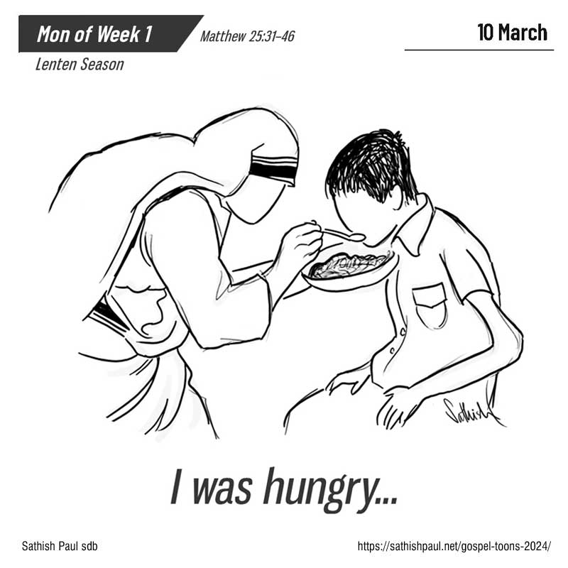 Alors ils répondront, eux aussi: ‘Seigneur, quand t’avons-nous vu avoir faim, avoir soif, être nu, étranger, malade ou en prison, sans nous mettre à ton service?’ Il leur répondra: ‘Amen, je vous le dis: chaque fois que vous ne l’avez pas fait à l’un de ces plus petits, c’est à moi que vous ne l’avez pas fait.’ Et ils s’en iront, ceux-ci au châtiment éternel, et les justes, à la vie éternelle.» (Mt 25,31-46)