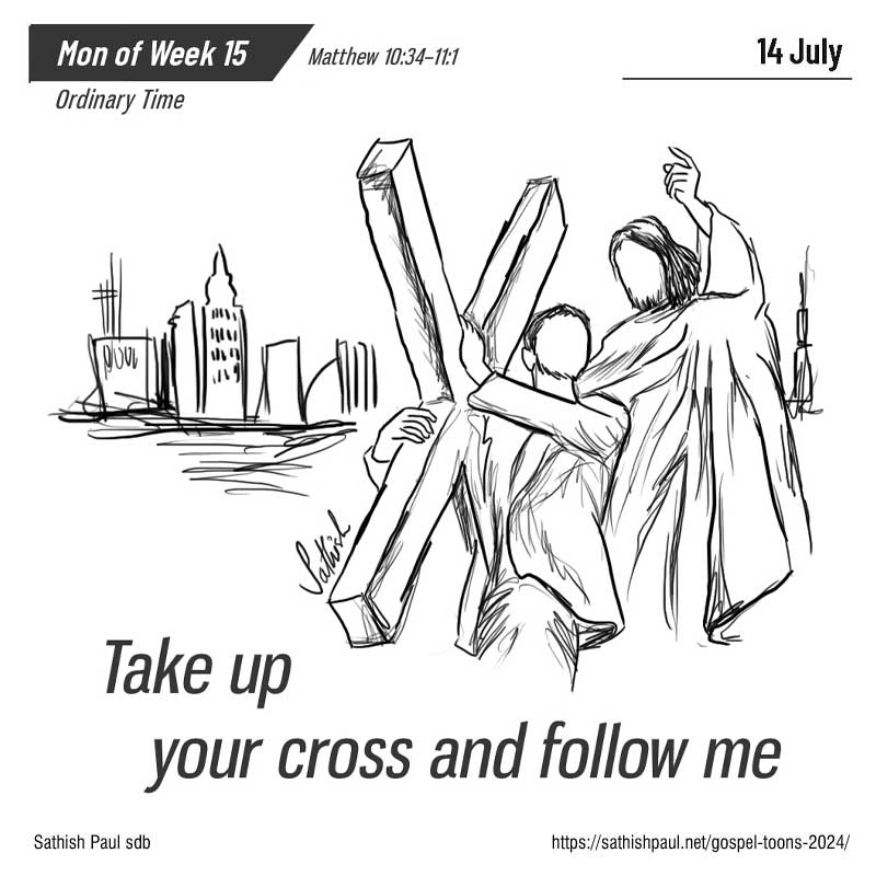 Celui qui aime son père ou sa mère plus que moi n’est pas digne de moi ; celui qui aime son fils ou sa fille plus que moi n’est pas digne de moi ; celui qui ne prend pas sa croix et ne me suit pas n’est pas digne de moi. Qui a trouvé sa vie la perdra ; qui a perdu sa vie à cause de moi la trouvera. Qui vous accueille m’accueille ; et qui m’accueille accueille Celui qui m’a envoyé. (Mt 10,34-11,1)