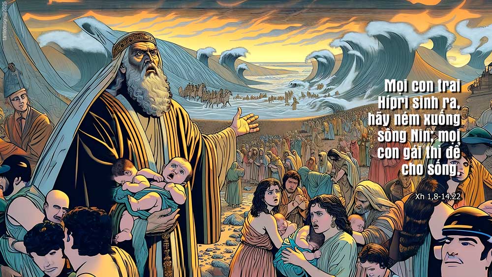 Thời ấy có một vua mới lên trị vì nước Ai-cập, vua này không biết ông Giu-se. Vua nói với dân mình: “Này đám dân con cái Ít-ra-en đông đúc và hùng mạnh hơn chúng ta. Chúng ta hãy dùng những biện pháp khôn ngoan đối với dân đó, đừng để chúng nên đông đúc, kẻo khi có chiến tranh, chúng hùa với địch mà đánh lại chúng ta, rồi ra khỏi xứ.” Người ta bèn đặt lên đầu lên cổ họ những viên đốc công, để hành hạ họ bằng những việc khổ sai, họ phải xây cho Pha-ra-ô các thành làm kho lương thực là Pi-thôm và Ram-xết. Nhưng chúng càng hành hạ họ, thì họ càng nên đông đúc và lan tràn, khiến chúng đâm ra sợ con cái Ít-ra-en. Người Ai-cập cưỡng bách con cái Ít-ra-en lao đông cực nhọc: phải trộn hồ làm gạch, phải làm đủ thứ công việc đồng áng; tóm lại, tất cả những việc lao động cực nhọc, chúng đều cưỡng bách họ làm. Pha-ra-ô ra lệnh cho toàn dân của mình: “Mọi con trai Híp-ri sinh ra, hãy ném xuống sông Nin; mọi con gái thì để cho sống.” Đó là lời Chúa.