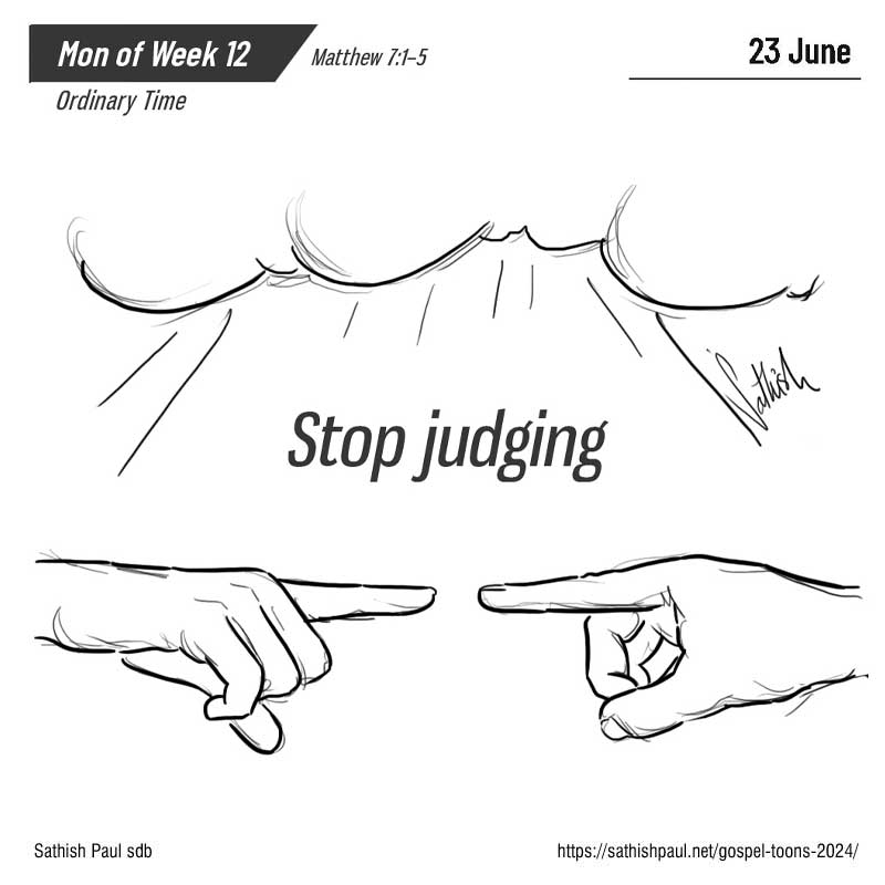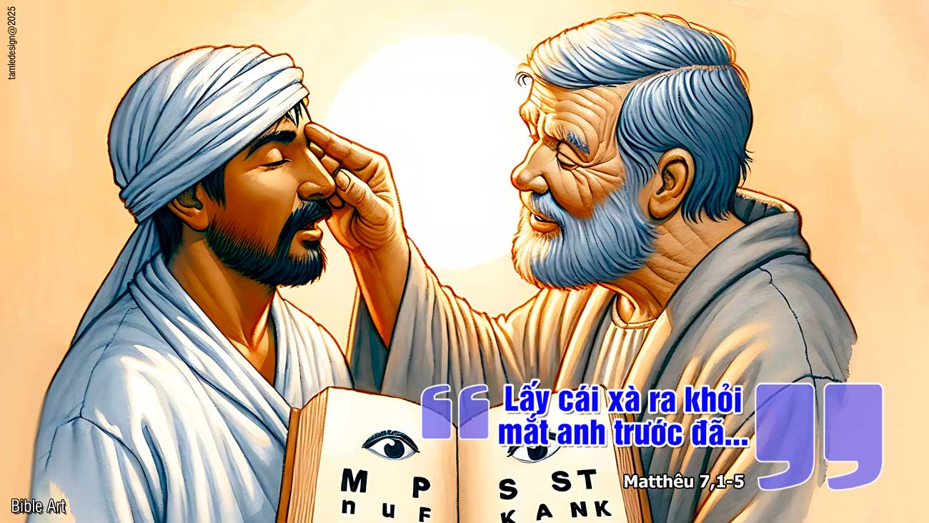 Một hôm, Đức Giê-su nói với các môn đệ rằng: “Anh em đừng xét đoán, để khỏi bị Thiên Chúa xét đoán, vì anh em xét đoán thế nào, thì anh em cũng sẽ bị Thiên Chúa xét đoán như vậy; và anh em đong bằng đấu nào, thì Thiên Chúa cũng sẽ đong cho anh em đấu ấy. Sao anh thấy cái rác trong con mắt của người anh em, mà cái xà trong con mắt của mình thì lại không để ý tới? Sao anh lại nói với người anh em: “Hãy để tôi lấy cái rác ra khỏi mắt bạn”, trong khi có cả một cái xà trong con mắt anh? Hỡi kẻ đạo đức giả! Lấy cái xà ra khỏi mắt anh trước đã, rồi anh sẽ thấy rõ, để lấy cái rác ra khỏi mắt người anh em.” Đó là lời Chúa.