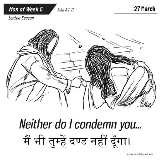 Khi ấy, Đức Giê-su đến núi Ô-liu. Vừa tảng sáng, Người trở lại Đền Thờ. Toàn dân đến với Người. Người ngồi xuống giảng dạy họ. Lúc đó, các kinh sư và người Pha-ri-sêu dẫn đến trước mặt Đức Giê-su một phụ nữ bị bắt gặp đang ngoại tình. Họ để chị ta đứng ở giữa, rồi nói với Người: “Thưa Thầy, người đàn bà này bị bắt quả tang đang ngoại tình. Trong sách Luật, ông Mô-sê truyền cho chúng tôi phải ném đá hạng đàn bà đó. Còn Thầy, Thầy nghĩ sao?” Họ nói thế nhằm thử Người, để có bằng cớ tố cáo Người. Nhưng Đức Giê-su cúi xuống lấy ngón tay viết trên đất. Vì họ cứ hỏi mãi, nên Người ngẩng lên và bảo họ: “Ai trong các ông sạch tội, thì cứ việc lấy đá mà ném trước đi.” Rồi Người lại cúi xuống viết trên đất. Nghe vậy, họ bỏ đi hết, kẻ trước người sau, bắt đầu từ những người lớn tuổi. Chỉ còn lại một mình Đức Giê-su, và người phụ nữ thì đứng ở giữa. Người ngẩng lên và nói: “Này chị, họ đâu cả rồi? Không ai lên án chị sao?” Người đàn bà đáp: “Thưa ông, không có ai cả.” Đức Giê-su nói: “Tôi cũng vậy, tôi không lên án chị đâu! Thôi chị cứ về đi, và từ nay đừng phạm tội nữa!” Đó là lời Chúa.