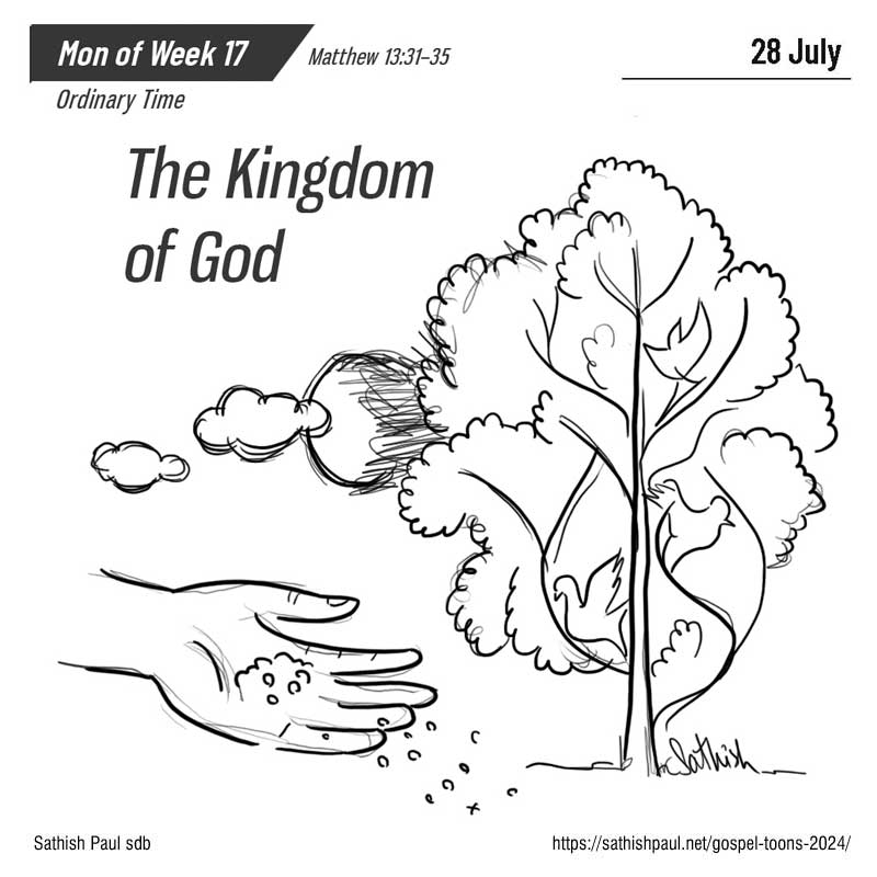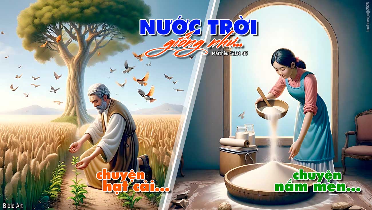 Hôm ấy, Đức Giê-su trình bày cho dân chúng nghe một dụ ngôn khác. Người nói: “Nước Trời cũng giống như chuyện hạt cải người nọ lấy gieo trong ruộng mình. Tuy nó là loại nhỏ nhất trong tất cả các hạt giống, nhưng khi lớn lên, thì lại là thứ rau lớn nhất; nó trở thành cây, đến nỗi chim trời tới làm tổ trên cành được”. Người còn kể cho họ một dụ ngôn khác: “Nước Trời cũng giống như chuyện nắm men bà kia lấy vùi vào ba đấu bột, cho đến khi tất cả bột dậy men”. Tất cả các điều ấy, Đức Giê-su dùng dụ ngôn mà nói với đám đông; và Người không nói gì với họ mà không dùng dụ ngôn, hầu ứng nghiệm lời sấm của ngôn sứ: Mở miệng ra, tôi sẽ kể dụ ngôn, công bố những điều được giữ kín từ tạo thiên lập địa. Đó là lời Chúa.