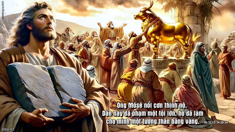 Ngày ấy, ông Mô-sê từ núi trở xuống, tay cầm hai tấm bia Chứng Ước; những bia ấy có viết cả hai mặt, mặt trước cũng như mặt sau. Những bia ấy là do Thiên Chúa làm ra, chữ là chữ của Thiên Chúa, khắc trên các bia. Ông Giô-suê nghe tiếng dân reo hò, thì nói với ông Mô-sê: “Có tiếng giao tranh trong trại!” Nhưng ông Mô-sê nói: “Tôi nghe không phải tiếng ca chiến thắng, không phải lời than bại trận, mà là tiếng ca đối đáp!” Vậy khi đến gần trại, ông thấy con bê và những bọn người đang nhảy múa. Ông Mô-sê nổi cơn thịnh nộ: Ông ném các tấm bia đang cầm trong tay và đập vỡ dưới chân núi. Ông lấy con bê họ đã làm, đốt đi, tán nhuyễn ra, rắc lên mặt nước, rồi bắt con cái Ít-ra-en uống. Ông Mô-sê bảo ông A-ha-ron: “Dân này đã làm gì ông mà ông đưa họ tới chỗ phạm tội tày trời như thế?” Ông A-ha-ron nói: “Xin ngài chớ bừng bừng nổi giận; chính ngài biết: dân này có khuynh hướng xấu. Họ nói với tôi: Xin ông làm cho chúng tôi một vị thần để dẫn đầu chúng tôi, vì chúng tôi không biết chuyện gì đã xảy ra cho cái ông Mô-sê này, là người đã đưa chúng tôi lên từ đất Ai-cập. Tôi nói với họ: Ai có vàng? Họ đã gỡ đổ vàng đeo tai và đưa cho tôi; tôi ném vào lửa, và đã ra con bê này.” Ngày hôm sau, ông Mô-sê nói với dân: “Anh em đã phạm một tội tày trời, nhưng giờ đây tôi sắp lên gặp Đức Chúa; may ra tôi sẽ xin được Người xá tội cho anh em.” Ông Mô-sê trở lại với Đức Chúa và thưa: “Than ôi, dân này đã phạm một tội tày trời! Họ đã làm cho mình một tượng thần bằng vàng! Nhưng giờ đây, ước gì Ngài miễn chấp tội họ! Bằng không, thì xin Ngài xoá tên con khỏi cuốn sách Ngài đã viết.” Đức Chúa phán với ông Mô-sê: “Kẻ nào phạm tội làm mất lòng Ta, Ta sẽ xoá tên nó khỏi cuốn sách của Ta. Bấy giờ, ngươi hãy đi, đưa dân tới nơi Ta đã chỉ cho ngươi. Này thiên sứ của Ta sẽ đi trước mặt ngươi; nhưng đến ngày Ta trừng phạt, Ta sẽ trừng phạt chúng vì tội đã phạm.” Đó là lời Chúa.