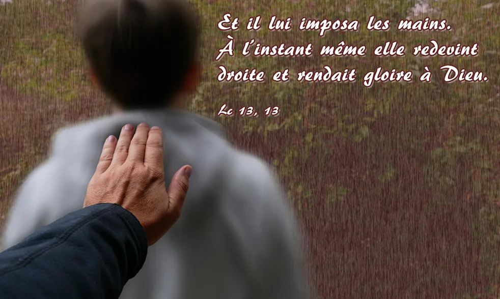 Voici qu’il y avait là une femme, possédée par un esprit qui la rendait infirme depuis dix-huit ans ; elle était toute courbée et absolument incapable de se redresser. Quand Jésus la vit, il l’interpella et lui dit: «Femme, te voici délivrée de ton infirmité.» Et il lui imposa les mains. À l’instant même elle redevint droite et rendait gloire à Dieu. (Lc 13,10-17)