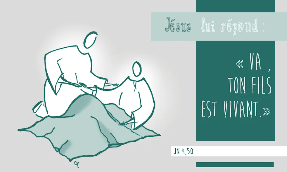 Ayant appris que Jésus arrivait de Judée en Galilée, il alla le trouver ; il lui demandait de descendre à Capharnaüm pour guérir son fils qui était mourant. Jésus lui dit: «Si vous ne voyez pas de signes et de prodiges, vous ne croirez donc pas!» Le fonctionnaire royal lui dit: «Seigneur, descends, avant que mon enfant ne meure!» Jésus lui répond : «Va, ton fils est vivant.» L’homme crut à la parole que Jésus lui avait dite et il partit. (Jn 4, 43-54)