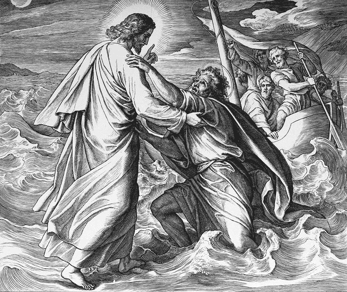Sau khi dân chúng được ăn no nê, Đức Giê-su liền bắt các môn đệ xuống thuyền qua bờ bên kia trước, trong lúc Người giải tán đám đông. Sau khi giải tán đám đông, Người đi riêng lên núi mà cầu nguyện. Chiều đến, Người vẫn ở đó một mình, còn chiếc thuyền thì đã ra xa bờ nhiều dặm, bị sóng đánh vì ngược gió. Vào khoảng canh tư, Người đi trên mặt biển mà đến với các môn đệ. Thấy Người đi trên mặt biển, các ông hoảng hốt bảo nhau: “Ma đấy!”, và sợ hãi la lên. Đức Giê-su liền bảo các ông: “Cứ yên tâm, chính Thầy đây, đừng sợ!” Ông Phê-rô liền thưa với Người: “Thưa Ngài, nếu quả là Ngài, thì xin truyền cho con đi trên mặt nước mà đến với Ngài”. Đức Giê-su bảo ông: “Cứ đến!” Ông Phê-rô từ thuyền bước xuống, đi trên mặt nước, và đến với Đức Giê-su. Nhưng thấy gió thổi thì ông đâm sợ, và khi bắt đầu chìm, ông la lên: “Thưa Ngài, xin cứu con với!” Đức Giê-su liền đưa tay nắm lấy ông và nói: “Người đâu mà kém tin vậy! Sao lại hoài nghi?” Khi thầy trò đã lên thuyền, thì gió lặng ngay. Những kẻ ở trong thuyền bái lạy Người và nói: “Quả thật Ngài là Con Thiên Chúa!” Đó là lời Chúa.
