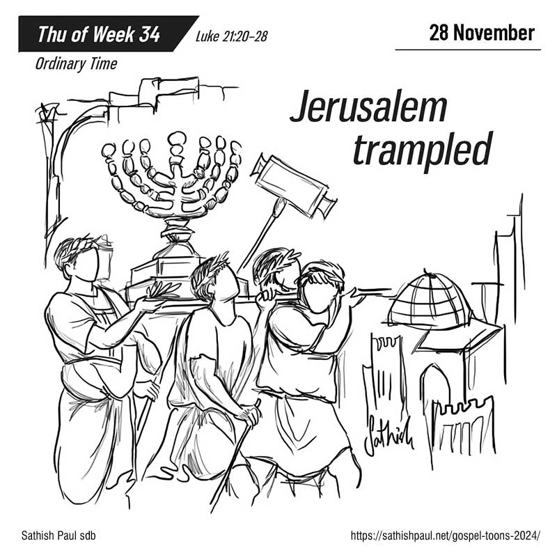 Khi ấy, Đức Giê-su nói với các môn đệ rằng: “Khi anh em thấy thành Giê-ru-sa-lem bị các đạo binh vây hãm, bấy giờ anh em hãy biết rằng đã gần đến ngày khốc hại của thành. Bấy giờ, ai ở miền Giu-đê, hãy trốn lên núi; ai ở trong thành, hãy bỏ đi nơi khác; ai ở vùng quê, thì chớ vào thành. Thật vậy, đó sẽ là những ngày báo oán, ngày mà tất cả những gì đã chép trong Kinh Thánh sẽ được ứng nghiệm. Khốn thay những người mang thai và những người đang cho con bú trong những ngày đó! “Vì sẽ có cơn khốn khổ cùng cực trên đất này, và cơn thịnh nộ giáng xuống dân này. Họ sẽ ngã gục dưới lưỡi gươm, sẽ bị đày đi khắp các dân các nước, và Giê-ru-sa-lem sẽ bị dân ngoại giày xéo, cho đến khi mãn thời của dân ngoại. “Sẽ có những điềm lạ trên mặt trời, mặt trăng và các vì sao. Dưới đất, muôn dân sẽ lo lắng hoang mang trước cảnh biển gào sóng thét. Người ta sợ đến hồn xiêu phách lạc, chờ những gì sắp giáng xuống địa cầu, vì các quyền lực trên trời sẽ bị lay chuyển. Bấy giờ thiên hạ sẽ thấy Con Người đầy quyền năng và vinh quang ngự trong đám mây mà đến. Khi những biến cố ấy bắt đầu xảy ra, anh em hãy đứng thẳng và ngẩng đầu lên, vì anh em sắp được cứu chuộc”. Đó là lời Chúa.