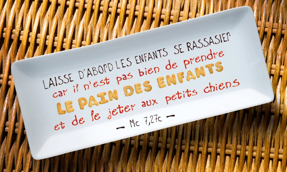 Il lui disait: «Laisse d’abord les enfants se rassasier, car il n’est pas bien de prendre le pain des enfants et de le jeter aux petits chiens.» Mais elle lui répliqua: «Seigneur, les petits chiens, sous la table, mangent bien les miettes des petits enfants!» (Mc 7,24-30)