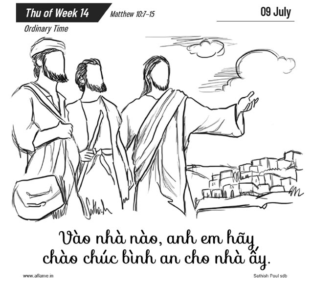 Hôm ấy, Đức Giê-su nói với các Tông Đồ: “Anh em hãy đến với các con chiên lạc nhà Ít-ra-en. Dọc đường hãy rao giảng rằng: Nước Trời đã đến gần. Anh em hãy chữa lành người đau yếu, làm cho kẻ chết sống lại, cho người phong hủi được sạch bệnh, và khử trừ ma quỷ. Anh em đã được cho không, thì cũng phải cho không như vậy. Đừng sắm vàng bạc, hay tiền đồng để giắt lưng. Đi đường, đừng mang bao bị, đừng mặc hai áo, đừng đi giày hay cầm gậy. Vì thợ thì đáng được nuôi ăn. “Khi anh em vào bất cứ thành nào hay làng nào, thì hãy dò hỏi xem ở đó ai là người xứng đáng, và hãy ở lại đó cho đến lúc ra đi. Vào nhà nào, anh em hãy chào chúc bình an cho nhà ấy. Nếu nhà ấy xứng đáng, thì bình an của anh em sẽ đến với họ; còn nếu nhà ấy không xứng đáng, thì bình an của anh em sẽ trở về với anh em. Còn nếu người ta không đón tiếp và nghe lời anh em, thì khi ra khỏi nhà hay thành ấy, anh em hãy giũ bụi chân lại. Thầy bảo thật anh em, trong Ngày phán xét, đất Xơ-đôm và Gô-mô-ra còn được xử khoan hồng hơn thành đó.” Đó là lời Chúa.
