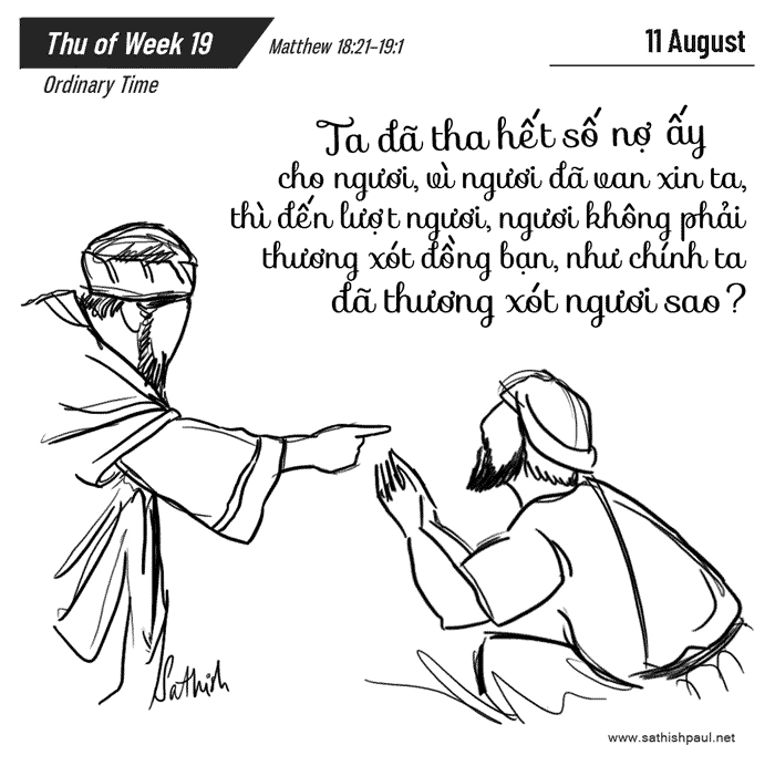 Bấy giờ, ông Phê-rô đến gần Đức Giê-su mà hỏi rằng: “Thưa Thầy, nếu anh em con cứ xúc phạm đến con, thì con phải tha đến mấy lần? Có phải bảy lần không?” Đức Giê-su đáp: “Thầy không bảo là đến bảy lần, nhưng là đến bảy mươi lần bảy”. Vì thế, Nước Trời cũng giống như chuyện một ông vua kia muốn đòi các đầy tớ của mình thanh toán sổ sách. Khi nhà vua vừa bắt đầu, thì người ta dẫn đến một kẻ mắc nợ vua mười ngàn nén vàng. Y không có gì để trả, nên tôn chủ ra lệnh bán y cùng tất cả vợ con, tài sản mà trả nợ. Bấy giờ, tên đầy tớ ấy sấp mình xuống bái lạy: “Thưa Ngài, xin rộng lòng hoãn lại cho tôi, tôi sẽ lo trả hết”. Tôn chủ của tên đầy tớ ấy liền chạnh lòng thương, cho y về và tha luôn món nợ. Nhưng vừa ra đến ngoài, tên đầy tớ ấy gặp một người đồng bạn, mắc nợ y một trăm quan tiền. Y liền túm lấy, bóp cổ mà bảo: “Trả nợ cho tao!” Bấy giờ, người đồng bạn sấp mình xuống năn nỉ: “Thưa anh, xin rộng lòng hoãn lại cho tôi, tôi sẽ lo trả anh”. Nhưng y không chịu, cứ tống anh ta vào ngục cho đến khi trả xong nợ. Thấy sự việc xảy ra như vậy, các đồng bạn của y buồn lắm, mới đi trình bày với tôn chủ đầu đuôi câu chuyện. Bấy giờ, tôn chủ cho đòi y đến và bảo: “Tên đầy tớ độc ác kia, ta đã tha hết số nợ ấy cho ngươi, vì ngươi đã van xin ta, thì đến lượt ngươi, ngươi không phải thương xót đồng bạn, như chính ta đã thương xót ngươi sao?” Rồi tôn chủ nổi cơn thịnh nộ, trao y cho lính hành hạ, cho đến ngày y trả hết nợ cho ông. Ấy vậy, Cha của Thầy ở trên trời cũng sẽ đối xử với anh em như thế, nếu mỗi người trong anh em không hết lòng tha thứ cho anh em mình”. Khi Đức Giê-su giảng dạy những điều ấy xong, Người rời khỏi miền Ga-li-lê và đi đến miền Giu-đê, bên kia sông Gio-đan. Đó là lời Chúa.