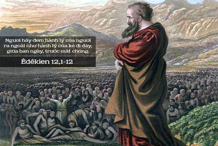 Có lời Đức Chúa phán với tôi rằng: Hỡi con người, ngươi đang sống giữa một nòi phản loạn, giữa những kẻ có mắt để nhìn mà không thấy, những kẻ có tai để nghe mà không nghe, vì chúng là một nòi phản loạn. Về phần ngươi, hỡi con người, hãy chuẩn bị hành lý đi đày và hãy đi giữa ban ngày trước mắt chúng; ngươi sẽ đi đày, rời chỗ ngươi đang ở mà tới một chỗ khác, trước mắt chúng. May ra chúng sẽ nhận thấy mình là một nòi phản loạn. Ngươi hãy đem hành lý của ngươi ra ngoài như hành lý của kẻ đi đày, giữa ban ngày, trước mắt chúng. Và chiều đến, ngươi sẽ ra đi trước mắt chúng như một kẻ phải đi đày. Trước mắt chúng, ngươi sẽ vác hành lý lên vai và ra đi lúc trời tối; ngươi sẽ che mặt để khỏi nhìn thấy xứ sở, vì Ta đã biến ngươi nên điềm báo cho nhà Ít-ra-en. Tôi đã làm y như lệnh Đức Chúa truyền cho tôi. Giữa ban ngày, tôi đã đem hành lý của tôi ra ngoài, hành lý của kẻ đi đày; và chiều đến, tôi lấy tay khoét tường. Tôi ra đi lúc trời tối và vác hành lý lên vai trước mặt họ. Sáng hôm sau, có lời Đức Chúa phán với tôi rằng: “Hỡi con người, chẳng phải nhà Ít-ra-en, nòi phản loạn, đã nói với ngươi: “Ông làm gì thế” sao? Ngươi hãy nói với chúng: “Đức Chúa là Chúa Thượng phán thế này: Sấm ngôn ấy nhằm nói về ông hoàng ở Giê-ru-sa-lem và toàn thể nhà Ít-ra-en ở trong thành. Ngươi hãy nói: “Tôi là điềm báo cho các ông. Tôi đã làm thế nào, thì sẽ xảy ra cho họ như vậy. Họ sẽ phải đi tù, đi đày. Ông hoàng đang ở giữa họ sẽ vác hành lý lên vai lúc trời tối và sẽ ra đi; họ sẽ khoét một lỗ trên tường cho ông chui qua. Ông sẽ che mặt để chính mắt khỏi nhìn thấy xứ sở.” Đó là lời Chúa.
