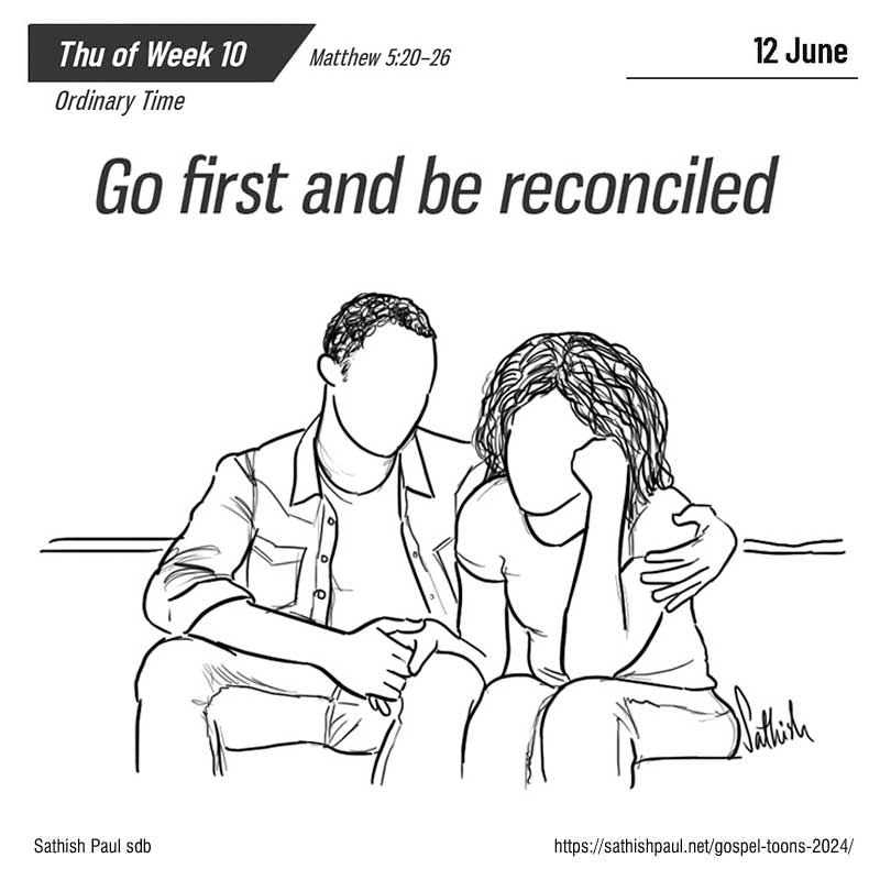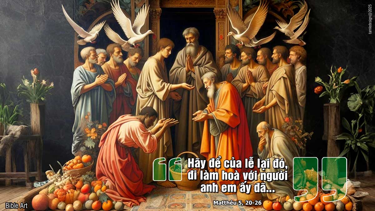 Khi ấy, Đức Giê-su nói với các môn đệ rằng: “Thầy bảo cho anh em biết, nếu anh em không ăn ở công chính hơn các kinh sư và người Pha-ri-sêu, thì sẽ chẳng được vào Nước Trời. “Anh em đã nghe Luật dạy người xưa rằng: Chớ giết người; ai giết người, thì đáng bị đưa ra toà. Còn Thầy, Thầy bảo cho anh em biết: Ai giận anh em mình, thì đáng bị đưa ra toà. Ai mắng anh em mình là đồ ngốc, thì đáng bị đưa ra trước Thượng Hội Đồng. Còn ai chửi anh em mình là quân phản đạo, thì đáng bị lửa hoả ngục thiêu đốt. Vậy, nếu khi anh sắp dâng lễ vật trước bàn thờ, mà sực nhớ có người anh em đang có chuyện bất bình với anh, thì hãy để của lễ lại đó trước bàn thờ, đi làm hoà với người anh em ấy đã, rồi trở lại dâng lễ vật của mình. Anh hãy mau mau dàn xếp với đối phương, khi còn đang trên đường đi với người ấy tới cửa công, kẻo người ấy nộp anh cho quan toà, quan toà lại giao anh cho thuộc hạ, và anh sẽ bị tống ngục. Thầy bảo thật cho anh biết: anh sẽ không ra khỏi đó, trước khi trả hết đồng xu cuối cùng. Đó là lời Chúa.