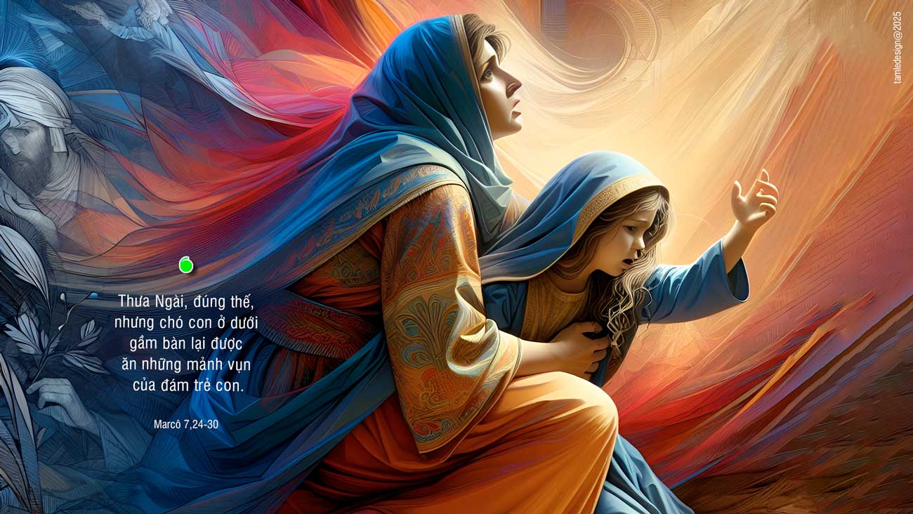 Một hôm, Đức Giê-su đến địa hạt Tia. Người vào một nhà nọ mà không muốn cho ai biết, nhưng không thể giấu được. Thật vậy, một người đàn bà có đứa con gái nhỏ bị quỷ ám, vừa nghe nói đến Người, liền vào sấp mình dưới chân Người. Bà là người Hy-lạp, gốc Phê-ni-xi thuộc xứ Xy-ri-a. Bà xin Người trừ quỷ cho con gái bà. Người nói với bà: “Phải để cho con cái ăn no trước đã, vì không được lấy bánh dành cho con cái mà ném cho chó con.” Bà ấy đáp: “Thưa Ngài, đúng thế, nhưng chó con ở dưới gầm bàn lại được ăn những mảnh vụn của đám trẻ con.” Người nói với bà: “Vì bà nói thế, nên bà cứ về đi, quỷ đã xuất khỏi con gái bà rồi.” Về đến nhà, bà thấy đứa trẻ nằm trên giường và quỷ đã xuất khỏi. Đó là lời Chúa.