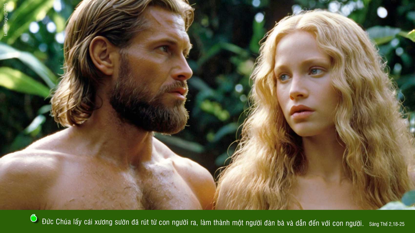 Đức Chúa là Thiên Chúa phán: “Con người ở một mình thì không tốt. Ta sẽ làm cho nó một trợ tá tương xứng với nó. Đức Chúa là Thiên Chúa lấy đất nặn ra mọi dã thú, mọi chim trời, và dẫn đến với con người, xem con người gọi chúng là gì: hễ con người gọi mỗi sinh vật là gì, thì tên nó sẽ là thế. Con người đặt tên cho mọi súc vật, mọi chim trời và mọi dã thú, nhưng con người không tìm cho mình được một trợ tá tương xứng. Đức Chúa là Thiên Chúa cho một giấc ngủ mê ập xuống trên con người, và con người thiếp đi. Rồi Chúa rút một cái xương sườn của con người ra, và lắp thịt thế vào. Đức Chúa là Thiên Chúa lấy cái xương sườn đã rút từ con người ra, làm thành một người đàn bà và dẫn đến với con người. Con người nói: “Phen này, đây là xương bởi xương tôi, thịt bởi thịt tôi! Nàng sẽ được gọi là đàn bà, vì đã được rút từ đàn ông ra.” Bởi thế, người đàn ông lìa cha mẹ mà gắn bó với vợ mình, và cả hai thành một xương một thịt. Con người và vợ mình, cả hai đều trần truồng mà không xấu hổ trước mặt nhau. Đó là lời Chúa.