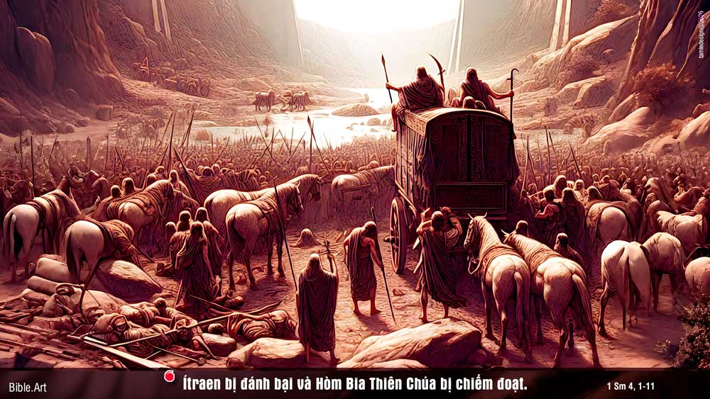 Hồi đó, Ít-ra-en ra giao chiến với người Phi-li-tinh. Họ đóng trại ở gần E-ven Ha E-de, còn người Phi-li-tinh thì đóng trại ở A-phếch. Người Phi-li-tinh dàn quân đối diện với quân Ít-ra-en, cuộc chiến trở nên ác liệt và Ít-ra-en bị người Phi-li-tinh đánh bại: tại mặt trận, ở ngoài đồng, chúng đã giết chừng bốn ngàn người. Khi dân trở về trại, các kỳ mục Ít-ra-en nói: “Sao hôm nay Đức Chúa để chúng ta bị người Phi-li-tinh đánh bại? Chúng ta hãy đi Si-lô lấy Hòm Bia Giao Ước của Đức Chúa về: Hòm Bia sẽ đến giữa chúng ta và sẽ cứu chúng ta khỏi bàn tay quân thù.” Dân sai người đi Si-lô; từ đó họ mang Hòm Bia về, Hòm Bia Giao Ước của Đức Chúa các đạo binh, Đấng ngự trên các thần hộ giá; ở đó, bên cạnh Hòm Bia Giao Ước của Thiên Chúa, có hai con ông Ê-li là Khóp-ni và Pin-khát. Khi Hòm Bia Giao Ước của Đức Chúa xuống trại, toàn thể Ít-ra-en hò reo vang dội khiến đất rung chuyển. Người Phi-li-tinh nghe thấy tiếng hò reo thì hỏi nhau: “Tiếng hò reo vang dội ấy trong trại bọn Híp-ri là gì vậy?” Chúng biết là Hòm Bia Đức Chúa đã đến trại. Người Phi-li-tinh sợ hãi, vì chúng nói: “Một vị thần đã đến trại!” Chúng bảo nhau: “Khốn thân ta, vì trước đây không có như vậy! Khốn thân ta! Ai sẽ giải thoát ta khỏi tay những thần hùng mạnh ấy? Đó là những thần đã dùng mọi thứ đòn mà đánh phạt người Ai-cập trong sa mạc. Hỡi người Phi-li-tinh, can đảm lên, hãy tỏ ra là nam nhi, kẻo phải làm nô lệ cho bọn Híp-ri như chúng đã làm nô lệ cho anh em. Hãy tỏ ra là nam nhi và chiến đấu!” Người Phi-li-tinh giao chiến. Ít-ra-en bị đánh bại và ai nấy chạy trốn về lều của mình. Đó là một đòn rất đau : về phía Ít-ra-en có ba mươi ngàn bộ binh tử trận. Hòm Bia Thiên Chúa bị chiếm đoạt, và hai con ông Ê-li là Khóp-ni và Pin-khát bị giết. Đó là lời Chúa.