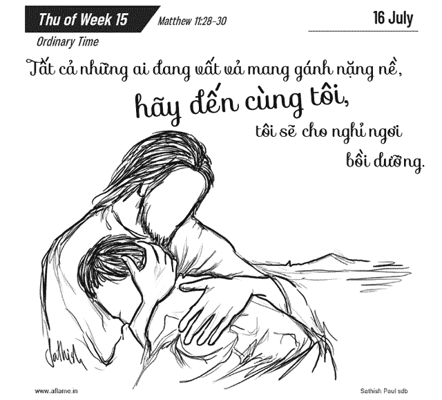 Khi ấy, Đức Giê-su cất tiếng nói: “Tất cả những ai đang vất vả mang gánh nặng nề, hãy đến cùng tôi, tôi sẽ cho nghỉ ngơi bồi dưỡng. Anh em hãy mang lấy ách của tôi, và hãy học với tôi, vì tôi có lòng hiền hậu và khiêm nhường. Tâm hồn anh em sẽ được nghỉ ngơi bồi dưỡng. Vì ách tôi êm ái, và gánh tôi nhẹ nhàng”. Đó là lời Chúa.
