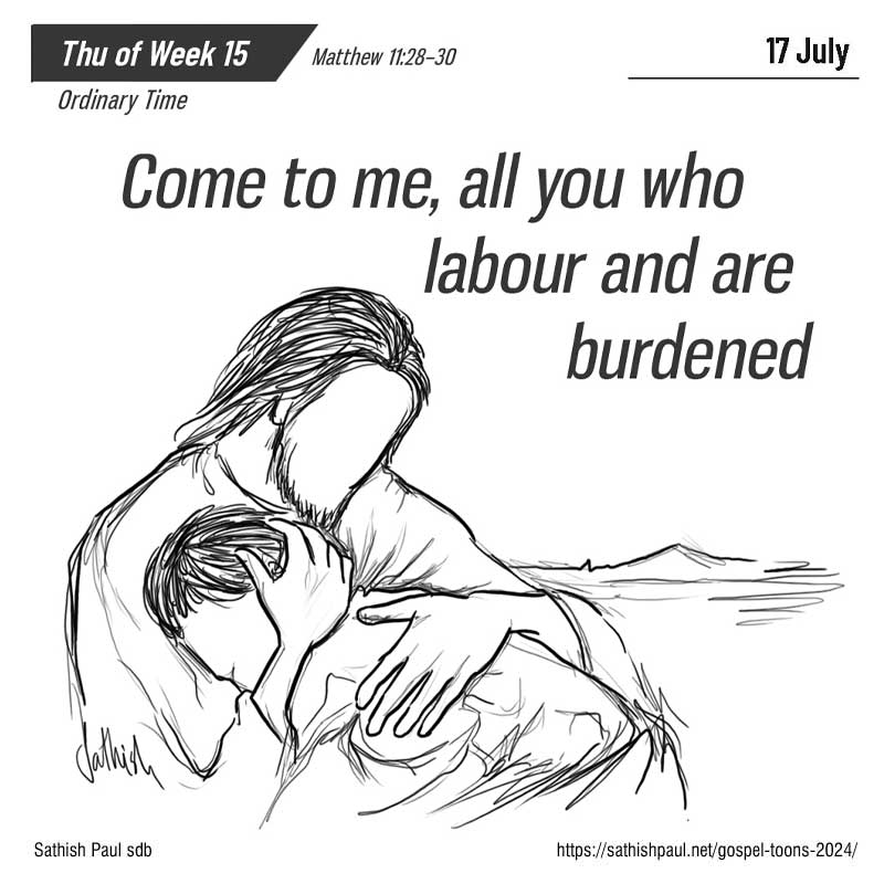 Khi ấy, Đức Giê-su cất tiếng nói: “Tất cả những ai đang vất vả mang gánh nặng nề, hãy đến cùng tôi, tôi sẽ cho nghỉ ngơi bồi dưỡng. Anh em hãy mang lấy ách của tôi, và hãy học với tôi, vì tôi có lòng hiền hậu và khiêm nhường. Tâm hồn anh em sẽ được nghỉ ngơi bồi dưỡng. Vì ách tôi êm ái, và gánh tôi nhẹ nhàng”. Đó là lời Chúa.