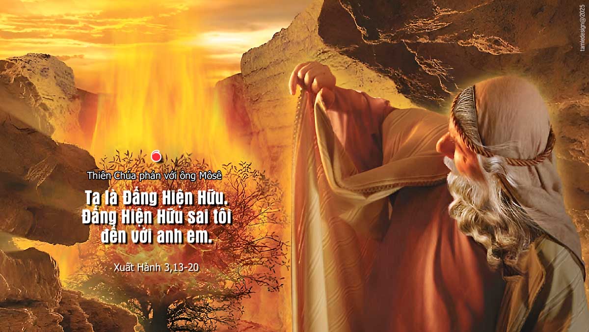 Ngày ấy, khi nghe tiếng Đức Chúa phán từ giữa bụi cây, ông Mô-sê thưa với Người: “Bây giờ, con đến gặp con cái Ít-ra-en và nói với họ: Thiên Chúa của cha ông anh em sai tôi đến với anh em. Vậy nếu họ hỏi con: ‘Tên Đấng ấy là gì’, thì con sẽ nói với họ làm sao?” Thiên Chúa phán với ông Mô-sê: “Ta là Đấng Hiện Hữu.” Người phán: “Ngươi nói với con cái Ít-ra-en thế này: “Đấng Hiện Hữu sai tôi đến với anh em.” Thiên Chúa lại phán với ông Mô-sê: “Ngươi sẽ nói với con cái Ít-ra-en thế này: Đức Chúa, Thiên Chúa của cha ông anh em, Thiên Chúa của Áp-ra-ham, Thiên Chúa của I-xa-ác, Thiên Chúa của Gia-cóp, sai tôi đến với anh em. Đó là danh Ta cho đến muôn thuở, đó là danh hiệu các ngươi sẽ dùng mà kêu cầu Ta từ đời nọ đến đời kia. Ngươi hãy đi triệu tập các kỳ mục Ít-ra-en và nói với họ: Đức Chúa, Thiên Chúa của cha ông anh em, Thiên Chúa của Áp-ra-ham, của I-xa-ác, của Gia-cóp, đã hiện ra với tôi và phán: Ta đã thật sự quan tâm đến các ngươi và cách người ta đối xử với các ngươi bên Ai-cập. Ta đã phán: Ta sẽ cho các ngươi thoát cảnh khổ cực bên Ai-cập mà lên miền đất người Ca-na-an, Khết, E-mô-ri, Pơ-rít-di, Khi-vi và Giơ-vút, lên miền đất tràn trề sữa và mật. Họ sẽ nghe tiếng ngươi; rồi ngươi sẽ đi với các kỳ mục Ít-ra-en đến cùng vua Ai-cập, các ngươi sẽ nói với vua ấy rằng: Đức Chúa, Thiên Chúa của người Híp-ri, đã cho chúng tôi được gặp Người. Giờ đầy, xin cho chúng tôi đi ba ngày đường vào sa mạc để tế lễ Đức Chúa, Thiên Chúa chúng tôi. Ta thừa biết rằng vua Ai-cập sẽ không cho các ngươi đi, trừ phi là có một bàn tay mạnh mẽ can thiệp. Ta sẽ ra tay, sẽ làm mọi thứ phép lạ giữa dân Ai-cập đẻ đánh nó, và sau đó vua ấy sẽ cho các ngươi đi. Đó là lời Chúa.