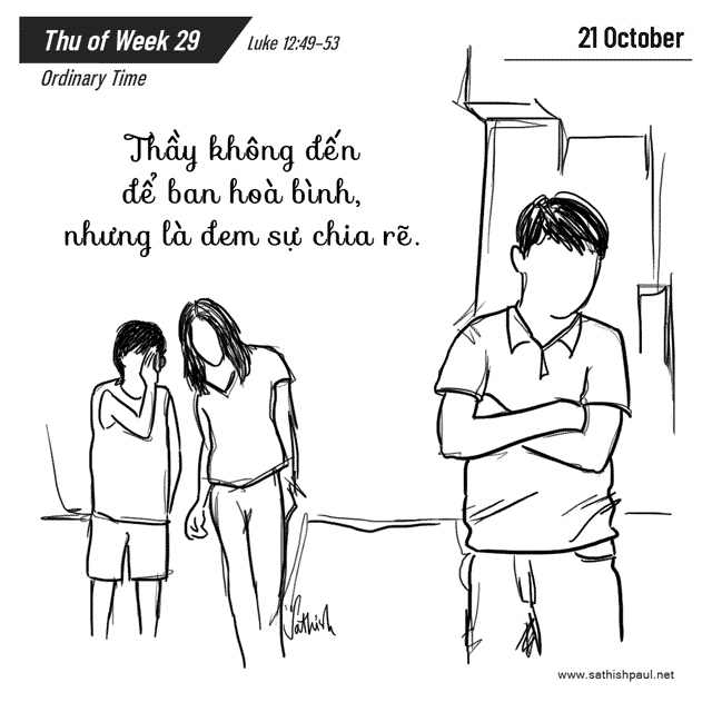 Một hôm, Đức Giê-su nói với các môn đệ rằng: “Thầy đã đến ném lửa vào mặt đất, và Thầy những ước mong phải chi lửa ấy đã bùng lên! Thầy còn một phép rửa phải chịu, và lòng Thầy khắc khoải biết bao cho đến khi việc này hoàn tất! “Anh em tưởng rằng Thầy đến để ban hoà bình cho trái đất sao? Thầy bảo cho anh em biết, không phải thế đâu, nhưng là đem sự chia rẽ. Vì từ nay, năm người trong cùng một nhà sẽ chia rẽ nhau, ba chống lại hai, hai chống lại ba. Họ sẽ chia rẽ nhau: cha chống lại con trai, con trai chống lại cha; mẹ chống lại con gái, con gái chống lại mẹ; mẹ chồng chống lại nàng dâu, nàng dâu chống lại mẹ chồng.” Đó là lời Chúa.