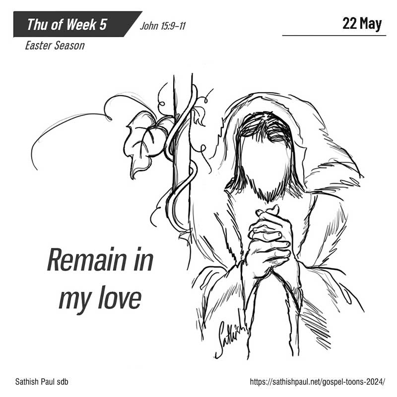 Khi ấy, Đức Giê-su nói với các môn đệ rằng: “Chúa Cha đã yêu mến Thầy thế nào, Thầy cũng yêu mến anh em như vậy. Anh em hãy ở lại trong tình thương của Thầy. Nếu anh em giữ các điều răn của Thầy, anh em sẽ ở lại trong tình thương của Thầy, như Thầy đã giữ các điều răn của Cha Thầy và ở lại trong tình thương của Người. Các điều ấy, Thầy đã nói với anh em để niềm vui của Thầy ở trong anh em, và niềm vui của anh em được nên trọn vẹn. Đó là lời Chúa.