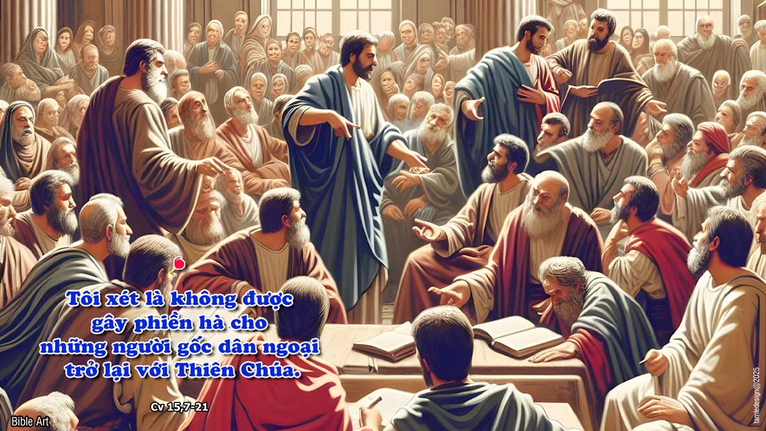 Sau khi các ông đã tranh luận nhiều, ông Phê-rô đứng lên nói: “Thưa anh em, anh em biết: ngay từ những ngày đầu, Thiên Chúa đã chọn tôi giữa anh em, để các dân ngoại được nghe lời Tin Mừng từ miệng tôi và tin theo. Thiên Chúa là Đấng thấu suốt mọi tâm can đã chứng tỏ Người chấp nhận họ, khi ban Thánh Thần cho họ cũng như đã ban cho chúng ta. Người không phân biệt chút nào giữa chúng ta với họ, vì đã dùng đức tin để thanh tẩy lòng họ. Vậy bây giờ, sao anh em lại thử thách Thiên Chúa, mà quàng vào cổ các môn đệ một cái ách mà cả cha ông chúng ta lẫn chúng ta đã không có sức mang nổi? Vả lại, chính nhờ ân sủng Chúa Giê-su mà chúng ta tin mình được cứu độ, cùng một cách như họ.” Bấy giờ toàn thể hội nghị im lặng. Họ nghe ông Ba-na-ba và ông Phao-lô thuật lại các dấu lạ điềm thiêng Thiên Chúa đã dùng hai ông mà làm giữa các dân ngoại. Khi hai ông dứt lời, ông Gia-cô-bê lên tiếng nói: “Thưa anh em, xin nghe tôi đây: Ông Si-mon đã thuật lại cho chúng ta rằng: ngay từ đầu, Thiên Chúa đã đoái thương chọn trong các dân ngoại một dân mang danh Người. Những lời các ngôn sứ cũng phù hợp với điều ấy, như đã chép: Sau đó, Ta sẽ trở lại, và sẽ xây dựng lại lều Đa-vít đã sụp đổ; đống hoang tàn đó, Ta sẽ xây dựng lại, và Ta sẽ dựng lại lều ấy. Như vậy các người còn lại và tất cả các dân ngoại được mang danh Ta sẽ tìm kiếm Chúa. Chúa phán như vậy, Người là Đấng cho biết những điều ấy tự ngàn xưa. “Vì vậy, phần tôi, tôi xét là không được gây phiền hà cho những người gốc dân ngoại trở lại với Thiên Chúa, nhưng chỉ viết thư bảo họ kiêng những thức ăn ô uế vì đã cúng cho ngẫu tượng, tránh gian dâm, kiêng ăn thịt loài vật không cắt tiết và kiêng ăn tiết. Thật vậy, từ những thế hệ xa xưa, trong mỗi thành ông Mô-sê đều có những người rao giảng: họ đọc lời của ông trong các hội đường mỗi ngày sa-bát.” Đó là lời Chúa.