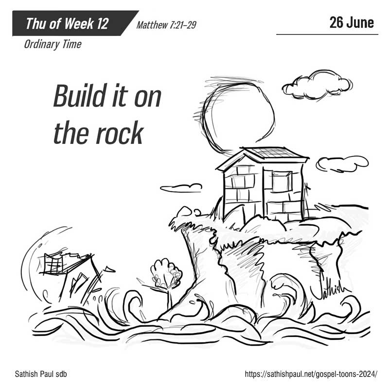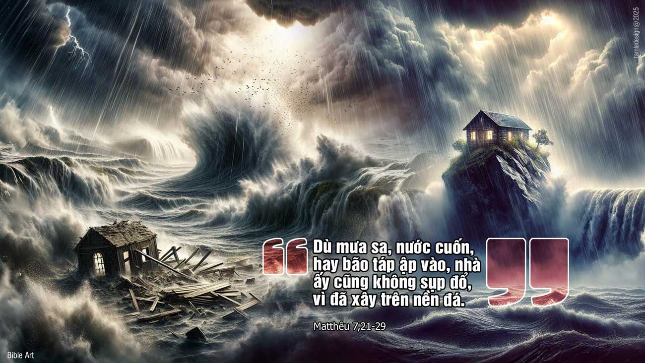 Một hôm,  Đức Giê-su nói với các môn đệ rằng: “Không phải bất cứ ai thưa với Thầy: ‘Lạy Chúa! lạy Chúa!’ là được vào Nước Trời cả đâu! Nhưng chỉ ai thi hành ý muốn của Cha Thầy là Đấng ngự trên trời, mới được vào mà thôi. Trong ngày ấy, nhiều người sẽ thưa với Thầy rằng: ‘Lạy Chúa, lạy Chúa, nào chúng tôi đã chẳng từng nhân danh Chúa mà nói tiên tri, nhân danh Chúa mà trừ quỷ, nhân danh Chúa mà làm nhiều phép lạ đó sao?’ Và bấy giờ Thầy sẽ tuyên bố với họ: ‘Ta không hề biết các ngươi; xéo đi cho khuất mắt Ta, hỡi bọn làm điều gian ác!’ Vậy ai nghe những lời Thầy nói đây mà đem ra thực hành, thì ví được như người khôn xây nhà trên đá. Dù mưa sa, nước cuốn, hay bão táp ập vào, nhà ấy cũng không sụp đổ, vì đã xây trên nền đá. Còn ai nghe những lời Thầy nói đây, mà chẳng đem ra thực hành, thì ví được như người ngu dại xây nhà trên cát. Gặp mưa sa, nước cuốn hay bão táp ập vào, nhà ấy sẽ sụp đổ, sụp đổ tan tành.” Khi Đức Giê-su giảng dạy những điều ấy xong, đám đông sửng sốt về lời giảng dạy của Người, vì Người giảng dạy như một Đấng có thẩm quyền, chứ không như các kinh sư của họ. Đó là lời Chúa.