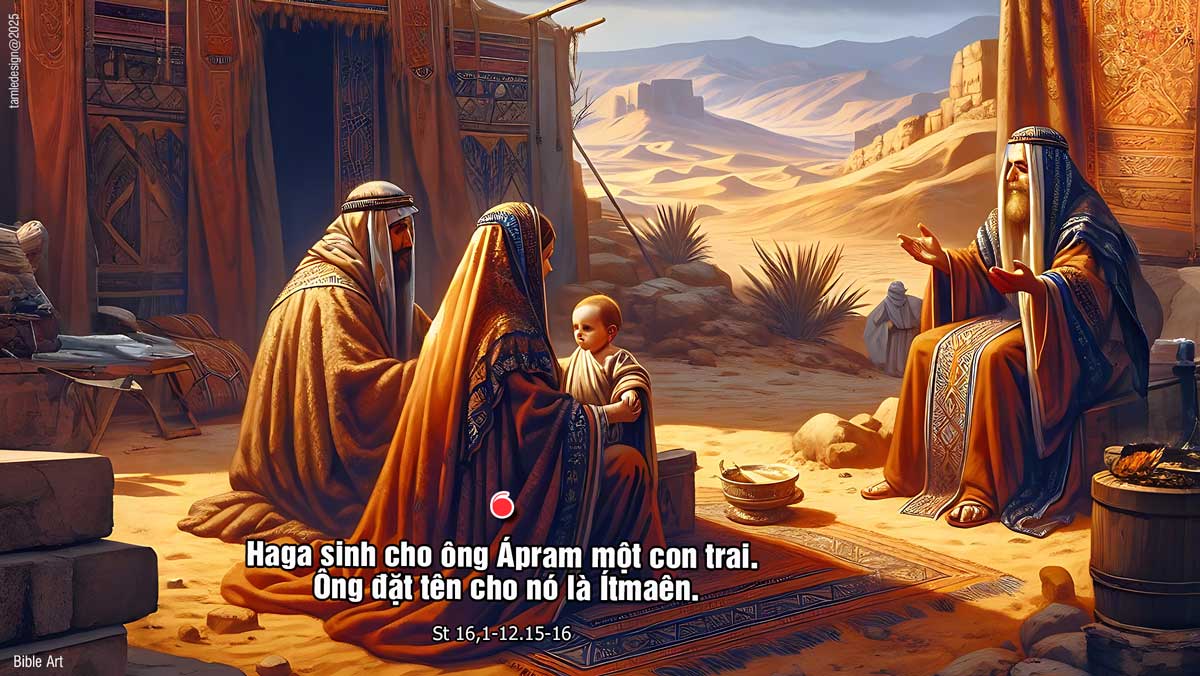 Bà Xa-rai, vợ ông Áp-ram, đã không sinh đuợc cho ông một người con nào. Bà có một người nữ tỳ Ai-cập, tên là Ha-ga. Bà Xa-rai nói với ông Áp-ram: “Ông coi: Đức Chúa đã không cho phép tôi sinh con. Vậy xin ông đi lại với nữ tỳ của tôi; may ra nhờ nó mà tôi sẽ có con.” Ông Áp-ram nghe lời bà Xa-rai. Mười năm sau khi ông Áp-ram lập nghiệp tại đất Ca-na-an, bà Xa-rai, vợ ông, đem nữ tỳ của bà là Ha-ga, người Ai-cập, hiến cho ông Áp-ram, chồng bà, để nàng làm vợ ông. Ông đi lại với Ha-ga và nàng có thai. Khi thấy mình có thai, thì nàng coi khinh bà chủ. Bà Xa-rai nói với ông Áp-ram: “Tôi bị sỉ nhục là tại ông đấy! Chính tôi đã đặt nữ tỳ của tôi vào lòng ông. Thế mà từ khi nó thấy mình có thai, nó coi khinh tôi. Xin Đức Chúa phân xử giữa ông và tôi.” Ông Áp-ram nói với bà Xa-rai: “Nữ tỳ của bà ở trong tay bà đấy; đối với nó, cái gì tốt cho bà thì bà cứ làm!” Bà Xa-rai hành hạ Ha-ga khiến nàng phải trốn bà. Sứ thần của Đức Chúa gặp thấy nàng trong sa mạc, gần một suối nước, suối ở trên đường đi Sua. Người hỏi: “Ha-ga, nữ tỳ của Xa-rai, ngươi từ đâu đến và đi đâu?” Nàng đáp: “Con đang trốn bà Xa-rai, chủ con.” Sứ thần của Đức Chúa bảo nàng: “Cứ về với bà chủ ngươi, và chịu lụy bà ấy.” Sứ thần của Đức Chúa nói với nàng: “Ta sẽ làm cho dòng dõi ngươi ra thật nhiều đến mức không thể đếm được vì quá đông.” Sứ thần của Đức Chúa nói với nàng: “Này đây ngươi đang có thai, sắp sinh hạ con trai và sẽ đặt tên là Ít-ma-ên, vì Đức Chúa đã nghe thấu nỗi khổ của ngươi. Con người đó đúng là một con lừa hoang, nó giơ tay chống mọi người, mọi người giơ tay chống nó, nó sẽ luôn đối đầu với tất cả anh em nó.” Ha-ga sinh cho ông Áp-ram một con trai, ông đặt tên cho đứa con mà Ha-ga đã sinh cho ông là Ít-ma-ên. Ông Áp-ram được tám mươi sáu tuổi khi Ha-ga sinh Ít-ma-ên cho ông. Đó là lời Chúa.