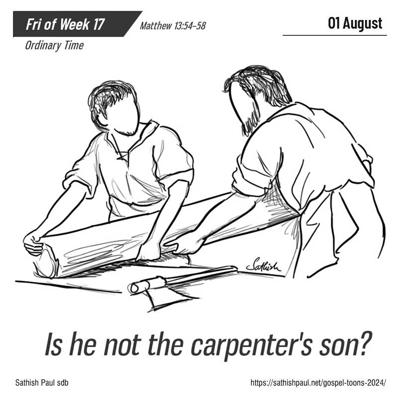 N’est-il pas le fils du charpentier ? Sa mère ne s’appelle-t-elle pas Marie, et ses frères : Jacques, Joseph, Simon et Jude ? Et ses sœurs ne sont-elles pas toutes chez nous ? Alors, d’où lui vient tout cela ? » Et ils étaient profondément choqués à son sujet. Jésus leur dit : « Un prophète n’est méprisé que dans son pays et dans sa propre maison. » Et il ne fit pas beaucoup de miracles à cet endroit-là, à cause de leur manque de foi. (Mt 13, 54-58)