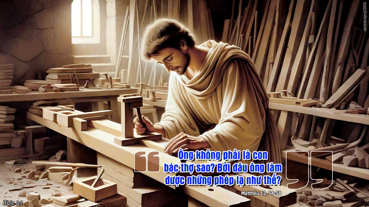 Khi ấy, Đức Giê-su về quê, giảng dạy dân chúng trong hội đường của họ, khiến họ sửng sốt và nói: “Bởi đâu ông ta được khôn ngoan và làm được những phép lạ như thế? Ông không phải là con bác thợ sao? Mẹ của ông không phải là bà Ma-ri-a; anh em của ông không phải là các ông Gia-cô-bê, Giô-xếp, Si-môn và Giu-đa sao? Và chị em của ông không phải đều là bà con lối xóm với chúng ta sao? Vậy bởi đâu ông ta được như thế? ” Và họ vấp ngã vì Người. Nhưng Đức Giê-su bảo họ: “Ngôn sứ có bị rẻ rúng, thì cũng chỉ là ở chính quê hương mình và trong gia đình mình mà thôi.” Người không làm nhiều phép lạ tại đó, vì họ không tin. Đó là lời Chúa.