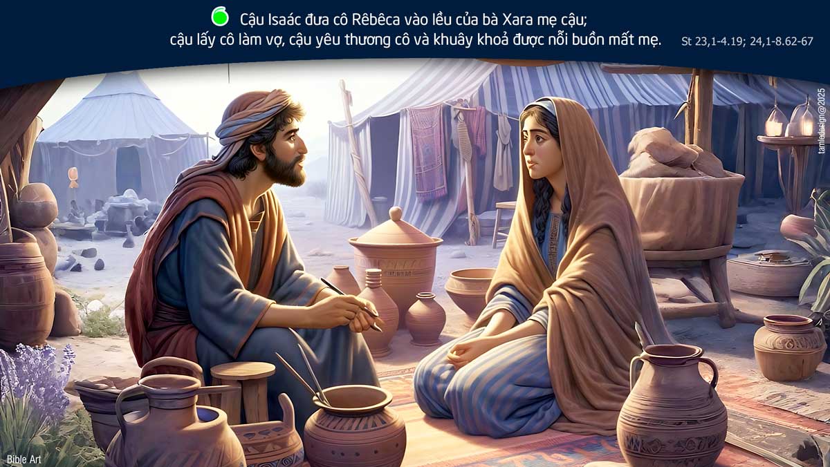 Bà Xa-ra sống được một trăm hai mươi bảy tuổi: đó là những năm bà Xa-ra đã sống. Bà Xa-ra qua đời tại Kia-giát Ác-ba, tức là Khép-rôn, trong đất Ca-na-an. Ông Áp-ra-ham đến làm lễ chôn cất bà và than khóc bà. Ông đứng dậy, để người chết đó và nói với con cái ông Khết rằng: “Tôi là ngoại kiều và là người khách ở giữa các ông. Xin các ông nhượng cho tôi một miếng đất riêng làm phần mộ ở giữa các ông, để tôi đem người chết của tôi đi chôn.” Sau đó, ông Áp-ra-ham chôn bà Xa-ra, vợ ông, trong hang của cánh đồng Mác-pê-la, đối diện với Mam-rê, tức là Khép-rôn, tại đất Ca-na-an. Ông Áp-ra-ham đã già nua tuổi tác, và Đức Chúa đã chúc phúc cho ông Áp-ra-ham trong mọi sự. Ông Áp-ra-ham bảo người lão bộc sống lâu năm nhất trong nhà ông, và cũng là người quản lý mọi tài sản của ông: “Chú hãy đặt tay dưới đùi tôi, và tôi xin chú nhân danh Đức Chúa là Chúa trời đất, mà thề rằng chú sẽ không cưới cho con trai tôi một người vợ trong số con gái xứ Ca-na-an, nơi tôi đang sống. Nhưng chú sẽ về quê tôi, đến với họ hàng tôi, mà cưới vợ cho con tôi là I-xa-ác.” Người lão bộc thưa với ông: “Có thể người đàn bà ấy không chịu đi theo tôi về đất này; vậy tôi có phải đưa cậu con trai ông về đất mà từ đó ông đã ra đi không?” Ông Áp-ra-ham bảo người ấy: “Coi chừng, đừng có đưa con trai tôi về đó! Đức Chúa là Chúa Trời, Đấng đã đưa tôi ra khỏi nhà cha tôi, khỏi quê hương tôi, Đấng đã phán với tôi và thề với tôi rằng: “Ta sẽ ban cho dòng dõi ngươi đất này”, chính Người sẽ sai sứ thần Người đi trước mặt chú, để từ nơi đó chú cưới vợ về cho con tôi. Nếu người đàn bà không chịu đi theo chú, thì chú không còn buộc phải giữ lời thề với tôi nữa. Nhưng dù sao, cũng đừng đưa con tôi về đó.” Sau một thới gian đầu, cậu I-xa-ác đã bỏ vùng giếng La-khai Rô-i, và đang ở trong miền Ne-ghép. Hôm ấy, cậu I-xa-ác ra ngoài đồng dạo mát lúc chiều tà. Ngước mắt lên, cậu thấy một bầy lạc đà đang tiến đến. Cùng lúc, cô Rê-bê-ca thấy cậu I-xa-ác, từ trên lưng lạc đà cô bèn nhảy xuống và hỏi người lão bộc: “Người đang đi ngoài đồng tiến về phía chúng ta là ai vậy?” Người lão bộc trả lời: “Chủ tôi đấy! ” Cô bèn lấy chiếc khăn che mặt. Người lão bộc thưa lại với cậu I-xa-ác tất cả những gì ông đã làm. Cậu I-xa-ác đưa cô Rê-bê-ca vào lều của bà Xa-ra mẹ cậu; cậu lấy cô làm vợ, cậu yêu thương cô và khuây khoả được nỗi buồn mất mẹ. Đó là lời Chúa.