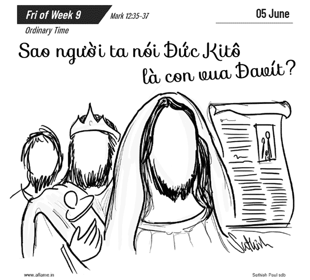 Hôm ấy, khi giảng dạy trong Đền Thờ, Đức Giê-su lên tiếng hỏi: “Sao các kinh sư lại nói Đấng Ki-tô là con vua Đa-vít? Chính vua Đa-vít được Thánh Thần soi sáng đã nói: Đức Chúa phán cùng Chúa Thượng tôi: bên hữu Cha đây, Con lên ngự trị, để rồi bao địch thù, Cha sẽ đặt dưới chân Con. Chính vua Đa-vít gọi Đấng Ki-tô là Chúa Thượng, thì do đâu Đấng Ki-tô lại là con vua ấy được?” Đám người đông đảo nghe Đức Giê-su cách thích thú. Đó là lời Chúa.