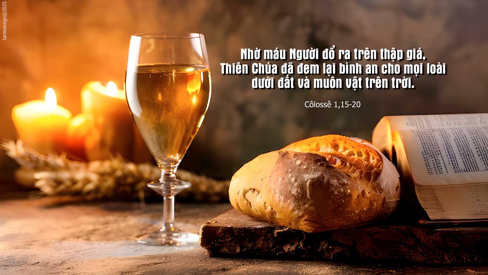 Đức Giê-su Ki-tô là hình ảnh Thiên Chúa vô hình, là trưởng tử sinh ra trước mọi loài thọ tạo, vì trong Người, muôn vật được tạo thành trên trời cùng dưới đất, hữu hình với vô hình. Dẫu là hàng dũng lực thần thiêng hay là bậc quyền năng thượng giới, tất cả đều do Thiên Chúa tạo dựng nhờ Người và cho Người. Người có trước muôn loài muôn vật, tất cả đều tồn tại trong Người. Người cũng là đầu của thân thể, nghĩa là đầu của Hội Thánh; Người là khởi nguyên, là trưởng tử trong số những người từ cõi chết sống lại, để trong mọi sự Người đứng hàng đầu. Vì Thiên Chúa đã muốn làm cho tất cả sự viên mãn hiện diện ở nơi Người, cũng như muốn nhờ Người mà làm cho muôn vật được hoà giải với mình. Nhờ máu Người đổ ra trên thập giá, Thiên Chúa đã đem lại bình an cho mọi loài dưới đất và muôn vật trên trời. Đó là lời Chúa.
