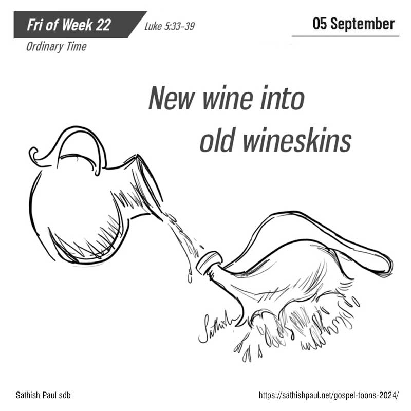 Một hôm, các người Pha-ri-sêu và các kinh sư nói với Đức Giê-su rằng: “Môn đệ ông Gio-an năng ăn chay cầu nguyện, môn đệ người Pha-ri-sêu cũng thế, còn môn đệ ông thì ăn với uống!” Đức Giê-su trả lời: “Chẳng lẽ các ông lại có thể bắt khách dự tiệc cưới ăn chay, khi chàng rể còn ở với họ? Sẽ có ngày chàng rể bị đem đi; ngày đó, họ mới ăn chay”. Đức Giê-su còn kể cho họ nghe dụ ngôn này: “Chẳng ai xé áo mới lấy vải vá áo cũ, vì như vậy, không những họ xé áo mới, mà miếng vải áo mới cũng không ăn với áo cũ. Không ai đổ rượu mới vào bầu da cũ, vì như vậy, rượu mới sẽ làm nứt bầu, sẽ chảy ra và bầu cũng hư. Nhưng rượu mới thì phải đổ vào bầu mới. Cũng không ai uống rượu cũ mà còn thèm rượu mới. Vì người ta nói: “Rượu cũ ngon hơn”. Đó là lời Chúa.