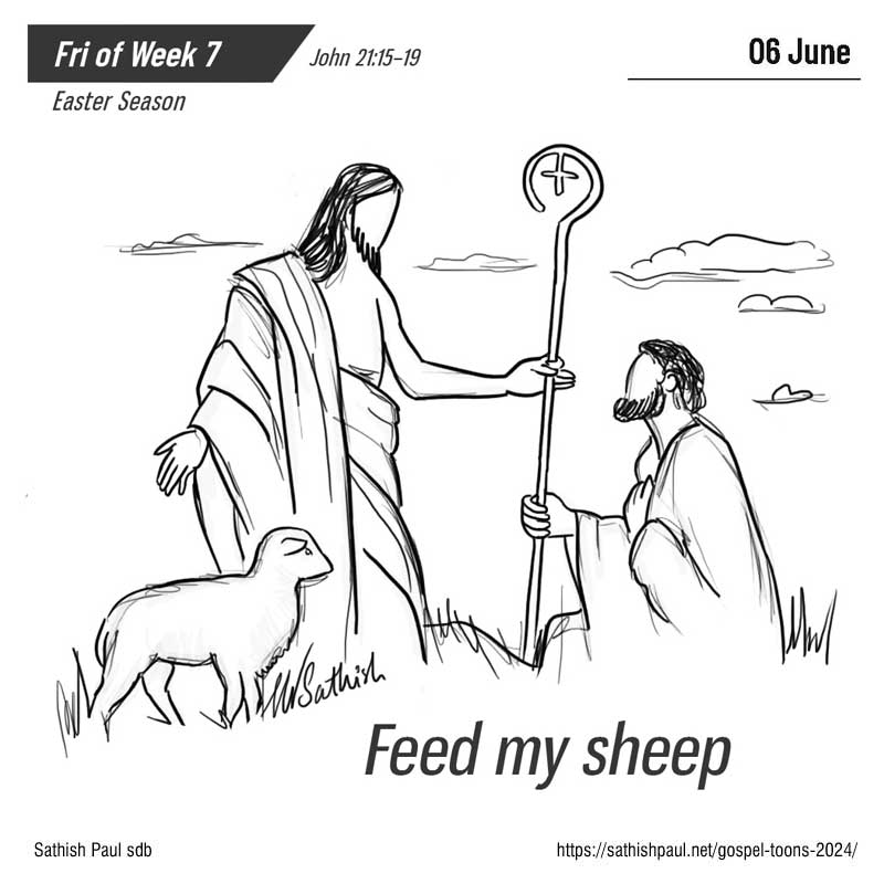 Jésus lui dit: «Sois le pasteur de mes brebis.» Il lui dit, pour la troisième fois: «Simon, fils de Jean, m’aimes-tu?» Pierre fut peiné parce que, la troisième fois, Jésus lui demandait: «M’aimes-tu?» Il lui répond: «Seigneur, toi, tu sais tout: tu sais bien que je t’aime.» Jésus lui dit: «Sois le berger de mes brebis.» (Jn 21, 15-19)