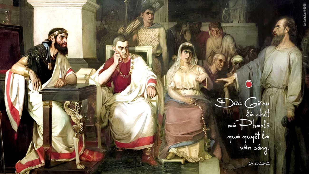 Hồi ấy, vua Ác-ríp-pa và bà Béc-ni-kê đến Xê-da-rê chào mừng ông Phét-tô. Vì hai người ở lại đó nhiều ngày, ông Phét-tô mới đem vụ ông Phao-lô ra trình bày với nhà vua. Ông nói: “Ở đây có một người tù ông Phê-lích để lại. Khi tôi tới Giê-ru-sa-lem, các thượng tế và các kỳ mục Do-thái đến kiện và xin tôi kết án người ấy. Tôi đã trả lời họ rằng người Rô-ma không có lệ nộp bị cáo nào, trước khi đương sự ra đối chất với nguyên cáo, và được cơ hội biện hộ về lời tố cáo. Vậy họ cùng đến đây với tôi, và không chút trì hoãn, ngày hôm sau tôi ra ngồi trên toà và truyền điệu đương sự đến. Đứng quanh đương sự, các nguyên cáo đã không đưa ra một tội trạng nào như tôi tưởng. Họ chỉ tranh luận với ông ta về một số vấn đề liên quan đến tôn giáo riêng của họ, và liên quan đến một ông Giê-su nào đó đã chết, mà Phao-lô quả quyết là vẫn sống. Phần tôi, phân vân trước cuộc tranh luận về những chuyện ấy, tôi hỏi xem ông ta có muốn đi Giê-ru-sa-lem để được xử tại đó về vụ này không. Nhưng Phao-lô đã kháng cáo, xin dành vụ này cho Thánh Thượng i xét xử, nên tôi đã ra lệnh giữ ông ta lại cho đến khi giải lên hoàng đế.” Đó là lời Chúa.