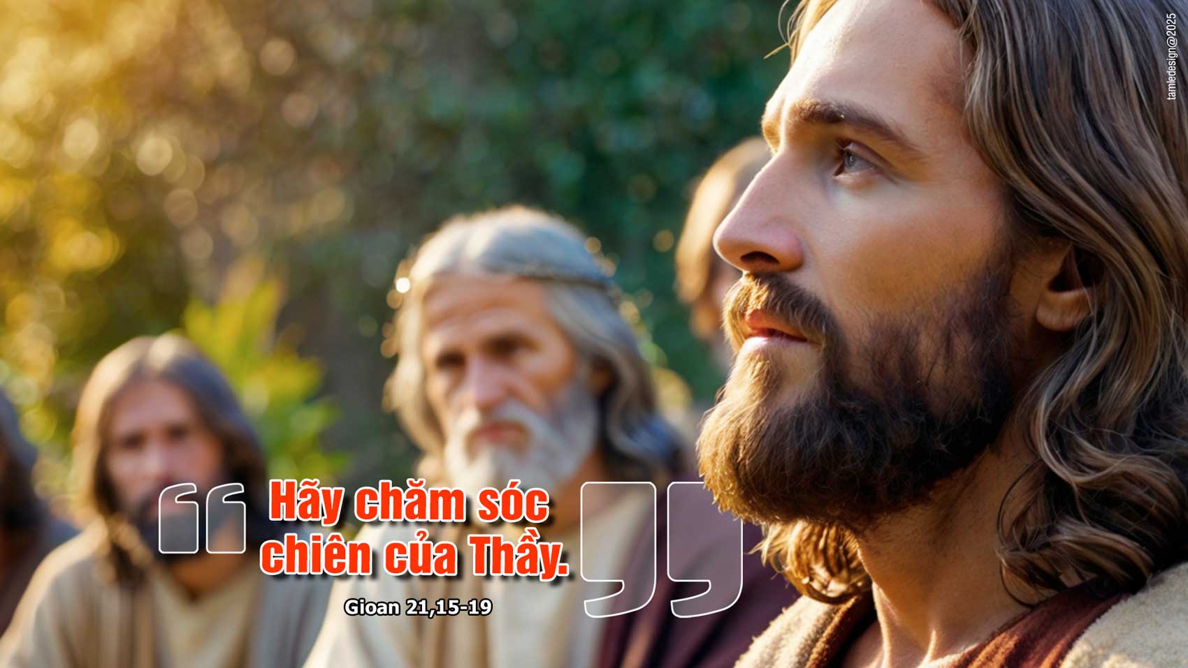 Khi ấy, Đức Giê-su hỏi ông Si-môn Phê-rô rằng: “Này anh Si-môn, con ông Gio-an, anh có mến Thầy hơn các anh em này không?” Ông đáp: “Thưa Thầy có, Thầy biết con yêu mến Thầy.” Đức Giê-su nói với ông: “Hãy chăm sóc chiên con của Thầy.” Người lại hỏi: “Này anh Si-môn, con ông Gio-an, anh có mến Thầy không?” Ông đáp: “Thưa Thầy có, Thầy biết con yêu mến Thầy.” Người nói: “Hãy chăn dắt chiên của Thầy.” Người hỏi lần thứ ba: “Này anh Si-môn, con ông Gio-an, anh có yêu mến Thầy không?” Ông Phê-rô buồn vì Người hỏi tới ba lần: “Anh có yêu mến Thầy không?” Ông đáp: “Thưa Thầy, Thầy biết rõ mọi sự; Thầy biết con yêu mến Thầy.” Đức Giê-su bảo: “Hãy chăm sóc chiên của Thầy. Thật, Thầy bảo thật cho anh biết: lúc còn trẻ, anh tự mình thắt lưng lấy, và đi đâu tuỳ ý. Nhưng khi đã về già, anh sẽ phải dang tay ra cho người khác thắt lưng và dẫn anh đến nơi anh chẳng muốn.” Người nói vậy, có ý ám chỉ ông sẽ phải chết cách nào để tôn vinh Thiên Chúa. Thế rồi, Người bảo ông: “Hãy theo Thầy.” Đó là lời Chúa.