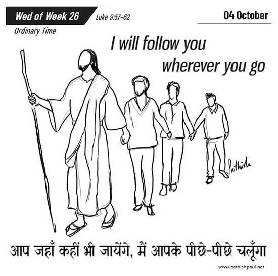 Một hôm, đang khi Đức Giê-su đi đường cùng các môn đệ, thì có kẻ thưa Người rằng: “Thưa Thầy, Thầy đi đâu, tôi cũng xin đi theo.” Người trả lời: “Con chồn có hang, chim trời có tổ, nhưng Con Người không có chỗ tựa đầu.” Đức Giê-su nói với một người khác: “Anh hãy theo tôi!” Người ấy thưa: “Thưa Thầy, xin cho phép tôi về chôn cất cha tôi trước đã.” Đức Giê-su bảo: “Cứ để kẻ chết chôn kẻ chết của họ. Còn anh, anh hãy đi loan báo Triều Đại Thiên Chúa.” Một người khác nữa lại nói: “Thưa Thầy, tôi xin theo Thầy, nhưng xin cho phép tôi từ biệt gia đình trước đã.” Đức Giê-su bảo: “Ai đã tra tay cầm cày mà còn ngoái lại đàng sau, thì không thích hợp với Nước Thiên Chúa.” Đó là lời Chúa.