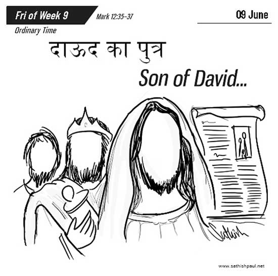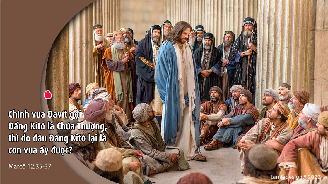 Hôm ấy, khi giảng dạy trong Đền Thờ, Đức Giê-su lên tiếng hỏi: “Sao các kinh sư lại nói Đấng Ki-tô là con vua Đa-vít? Chính vua Đa-vít được Thánh Thần soi sáng đã nói: Đức Chúa phán cùng Chúa Thượng tôi: bên hữu Cha đây, Con lên ngự trị, để rồi bao địch thù, Cha sẽ đặt dưới chân Con. Chính vua Đa-vít gọi Đấng Ki-tô là Chúa Thượng, thì do đâu Đấng Ki-tô lại là con vua ấy được?” Đám người đông đảo nghe Đức Giê-su cách thích thú. Đó là lời Chúa.