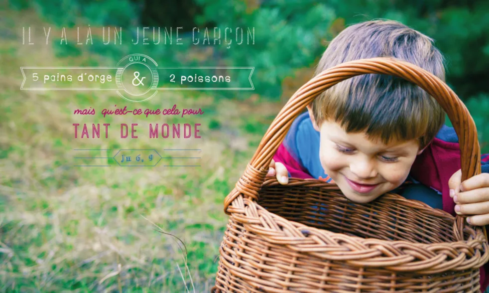 Un de ses disciples, André, le frère de Simon-Pierre, lui dit: «Il y a là un jeune garçon qui a cinq pains d’orge et deux poissons, mais qu’est-ce que cela pour tant de monde!» Jésus dit: «Faites asseoir les gens.» Il y avait beaucoup d’herbe à cet endroit. Ils s’assirent donc, au nombre d’environ cinq mille hommes. (Jn 6,1-15)