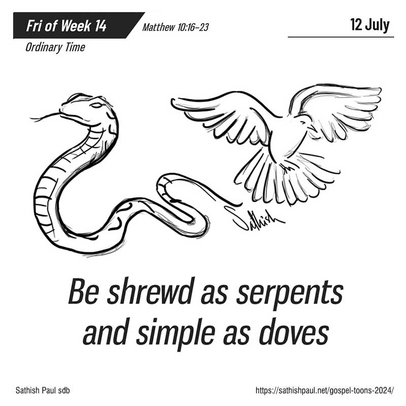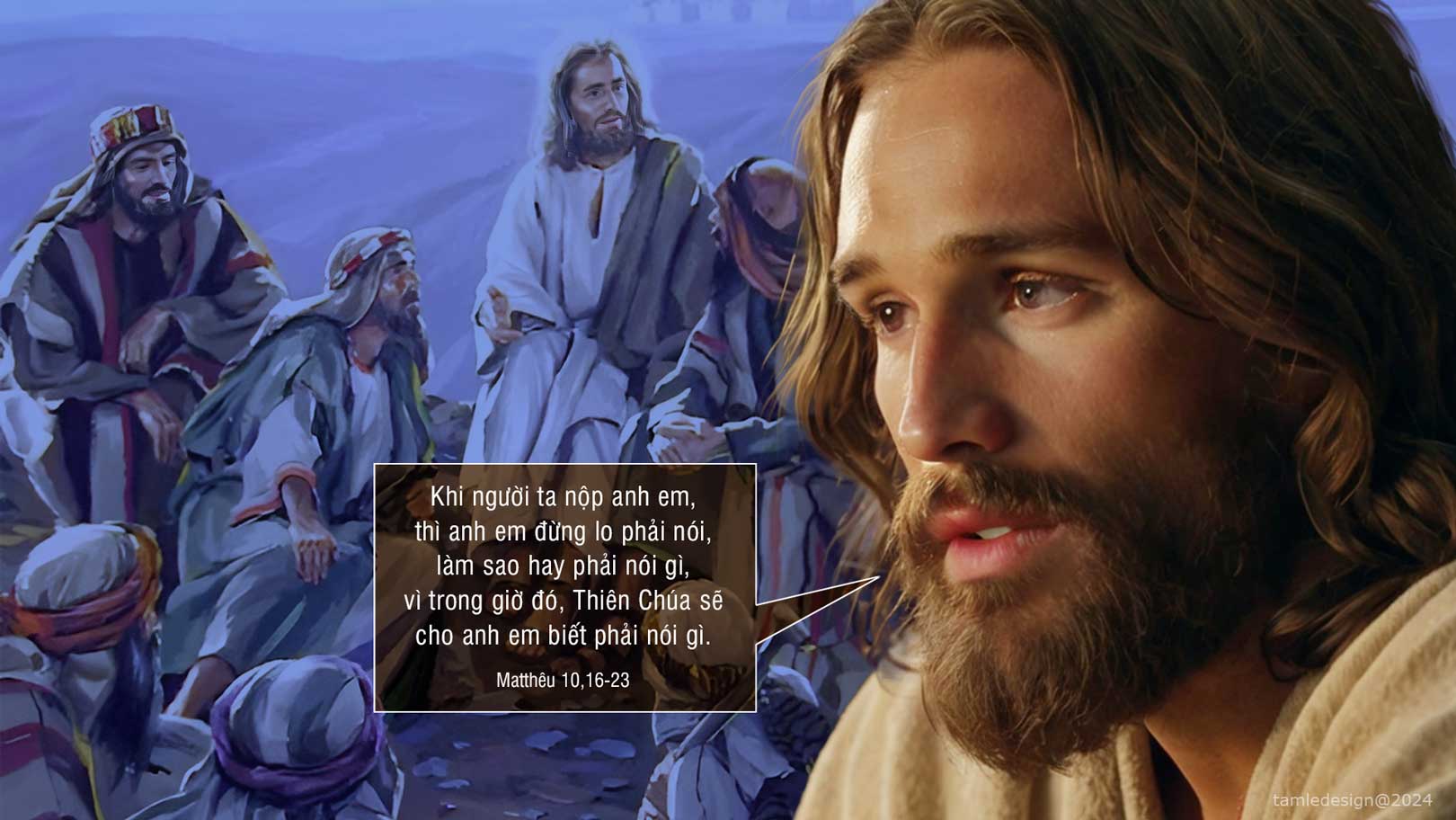 Hôm ấy, Đức Giê-su nói với các Tông Đồ rằng: “Này, Thầy sai anh em đi như chiên đi vào giữa bầy sói. Vậy anh em phải khôn như rắn và đơn sơ như bồ câu. Hãy coi chừng người đời. Họ sẽ nộp anh em cho các hội đồng, và sẽ đánh đập anh em trong các hội đường của họ. Và anh em sẽ bị điệu ra trước mặt vua chúa quan quyền vì Thầy để làm chứng cho họ và các dân ngoại được biết. Khi người ta nộp anh em, thì anh em đừng lo phải nói làm sao hay phải nói gì, vì trong giờ đó, Thiên Chúa sẽ cho anh em biết phải nói gì: thật vậy, không phải chính anh em nói, mà là Thần Khí của Cha anh em nói trong anh em. Anh sẽ nộp em, em sẽ nộp anh cho người ta giết; cha sẽ nộp con, con cái sẽ đứng lên chống lại cha mẹ và làm cho cha mẹ phải chết. Vì danh Thầy, anh em sẽ bị mọi người thù ghét. Nhưng kẻ nào bền chí đến cùng, kẻ ấy sẽ được cứu thoát. Khi người ta bách hại anh em trong thành này, thì hãy trốn sang thành khác. Thầy bảo thật anh em: anh em chưa đi hết các thành của Ít-ra-en, thì Con Người đã đến.” Đó là lời Chúa.