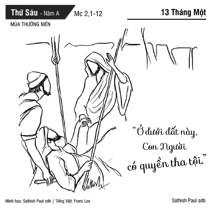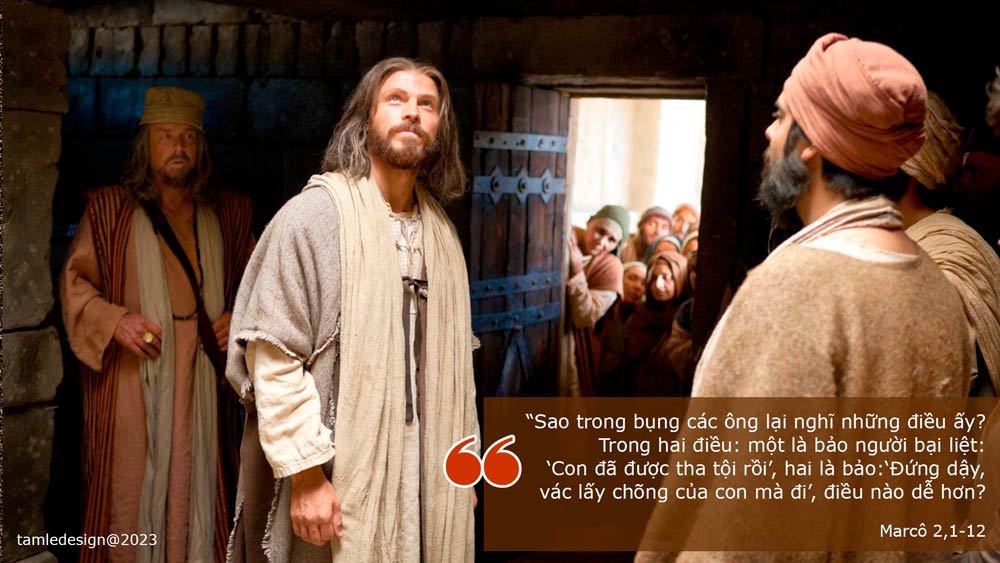 Bấy giờ, Đức Giê-su trở lại thành Ca-phác-na-um. Hay tin Người ở nhà, người ta tụ tập lại, đông đến nỗi ngoài cửa cũng không còn chỗ đứng. Người nói lời Thiên Chúa cho họ. Bấy giờ người ta đem đến cho Đức Giê-su một kẻ bại liệt, có bốn người khiêng. Nhưng vì dân chúng quá đông, nên họ không sao khiêng đến gần Người được. Họ mới dỡ mái nhà, ngay trên chỗ Người ngồi, làm thành một lỗ hổng, rồi thả người bại liệt nằm trên chõng xuống. Thấy họ có lòng tin như vậy, Đức Giê-su bảo người bại liệt: “Này con, con đã được tha tội rồi.” Nhưng có mấy kinh sư đang ngồi đó, họ nghĩ thầm trong bụng rằng: “Sao ông này lại dám nói như vậy? Ông ta nói phạm thượng! Ngoài một mình Thiên Chúa ra, ai có quyền tha tội?” Tâm trí Đức Giê-su thấu biết ngay họ đang thầm nghĩ như thế, Người mới bảo họ: “Sao trong bụng các ông lại nghĩ những điều ấy? Trong hai điều: một là bảo người bại liệt: ‘Con đã được tha tội rồi’, hai là bảo:‘Đứng dậy, vác lấy chõng của con mà đi’, điều nào dễ hơn? Vậy, để các ông biết: ở dưới đất này, Con Người có quyền tha tội, – Đức Giê-su bảo người bại liệt, – Ta truyền cho con: Hãy đứng dậy, vác lấy chõng của con mà đi về nhà!” Người bại liệt đứng dậy, và lập tức vác chõng đi ra trước mặt mọi người, khiến ai nấy đều sửng sốt và tôn vinh Thiên Chúa. Họ bảo nhau: “Chúng ta chưa thấy vậy bao giờ!” Đó là lời Chúa.