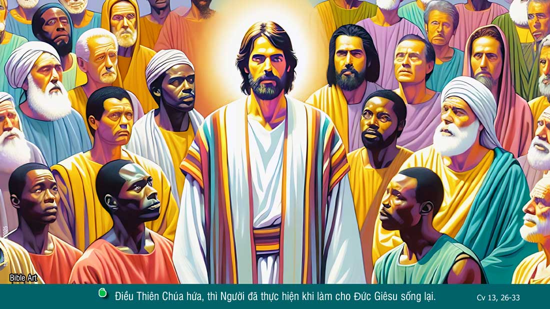 Khi đến An-ti-ô-khi-a miền Pi-xi-đi-a, ông Phao Lô đứng giữ hội đường và nói: “Thưa đồng bào It-ra-em và thưa anh em đang hiện diện nơi đây, là những người kính sợ Thiên Chúa, lời cứu độ này được gửi tới chúng ta. Dân cư thành Giê-ru-sa-lem và các thủ lãnh của họ đã không nhận biết Đức Giê-su; khi kết án Người, họ đã làm cho ứng nghiệm những lời ngôn sứ đọc mỗi ngày sa-bát. Tuy không thấy Người có tội gì đáng chết, họ vẫn đòi Phi-la-tô xử tử. Sau khi thực hiện tất cả mọi điều Kinh Thánh chép về Người, họ đã hạ Người từ trên cây gỗ xuống và mai táng trong mồ. Nhưng Thiên Chúa đã làm cho Người trỗi dậy từ cõi chết. Trong nhiều ngày, Đức Giê-su đã hiện ra với những kẻ từng theo Người từ Ga-li-lê lên Giê-ru-sa-lem. Giờ đây chính họ làm chứng cho Người trước mặt dân. “Còn chúng tôi, chúng tôi xin loan báo cho anh em Tin Mừng này: điều Thiên Chúa hứa với cha ông chúng ta, thì Người đã thực hiện cho chúng ta là con cháu các ngài, khi làm cho Đức Giê-su sống lại, đúng như lời đã chép trong Thánh vịnh 2: “Con là Con của Cha, ngày hôm nay Cha đã sinh ra Con.” Đó là lời Chúa