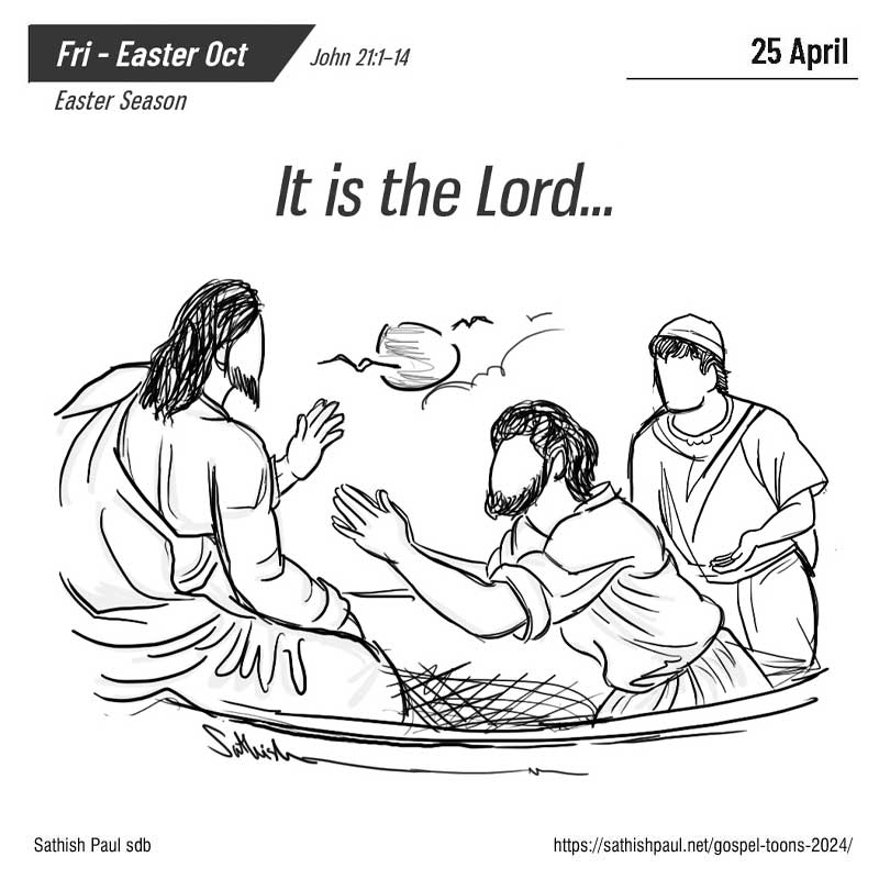 Au lever du jour, Jésus se tenait sur le rivage, mais les disciples ne savaient pas que c’était lui. Jésus leur dit: «Les enfants, auriez-vous quelque chose à manger?» Ils lui répondirent: «Non.» Il leur dit: «Jetez le filet à droite de la barque, et vous trouverez.» Ils jetèrent donc le filet, et cette fois ils n’arrivaient pas à le tirer, tellement il y avait de poissons. Alors, le disciple que Jésus aimait dit à Pierre: «C’est le Seigneur!» (Jn 21,1-14)