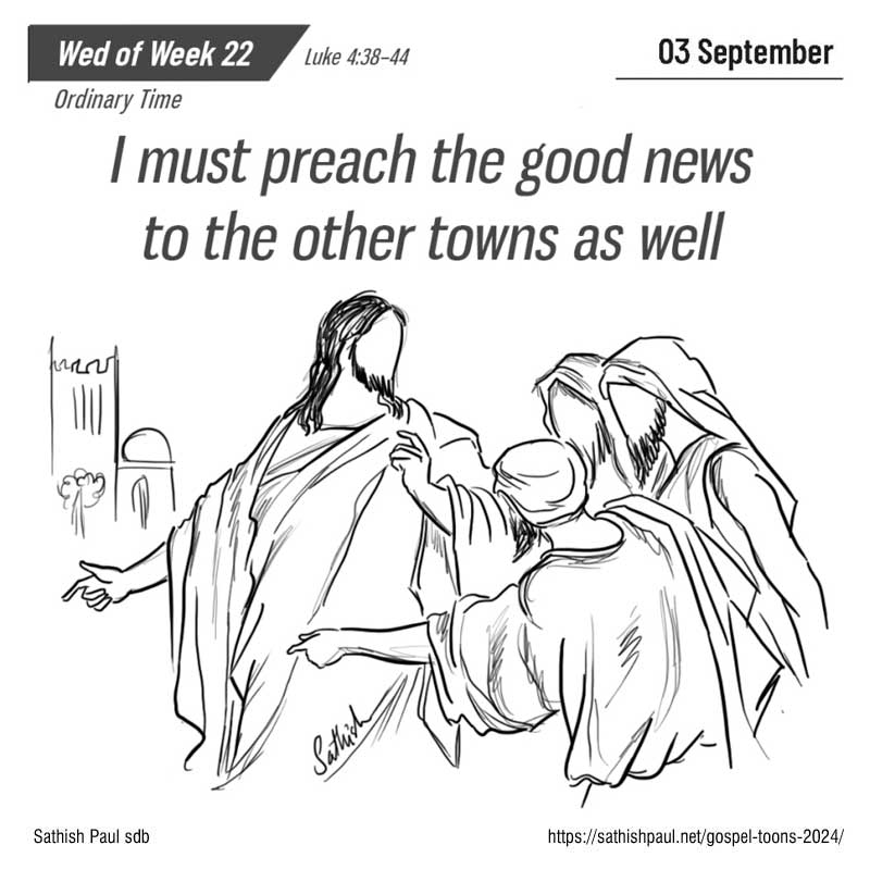 Quand il fit jour, Jésus sortit et s’en alla dans un endroit désert. Les foules le cherchaient ; elles arrivèrent jusqu’à lui, et elles le retenaient pour l’empêcher de les quitter. Mais il leur dit : « Aux autres villes aussi, il faut que j’annonce la Bonne Nouvelle du règne de Dieu, car c’est pour cela que j’ai été envoyé. » Et il proclamait l’Évangile dans les synagogues du pays des Juifs. (Lc 4, 38-44)